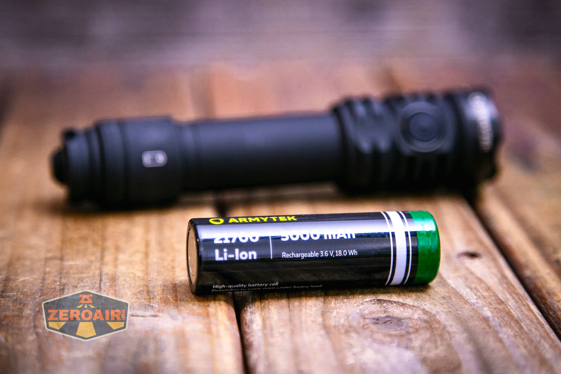 The Armytek Dobermann Pro Max tactical flashlight runs a single lithium-ion cell. In this case, a 5000mAh 21700 is included. It’s a standard cell.