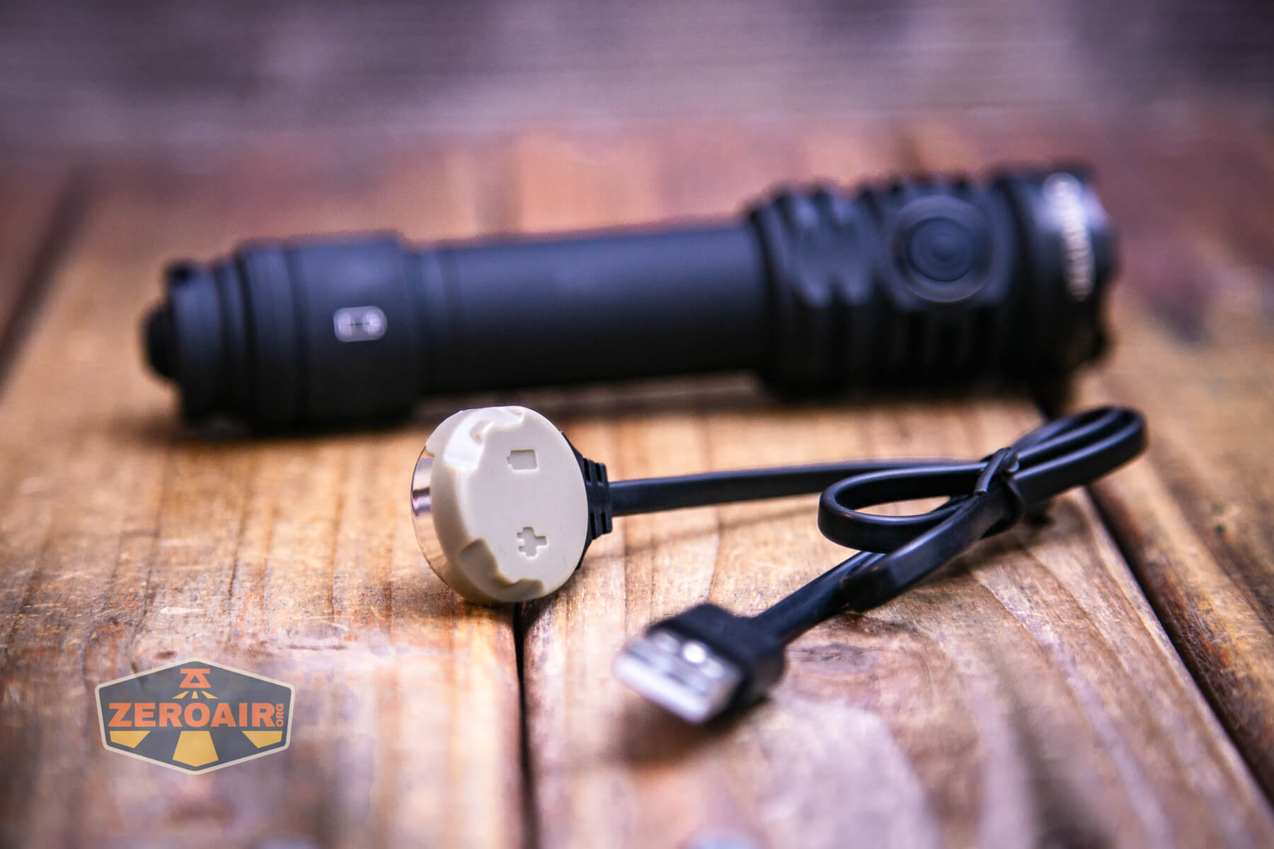 The Armytek Dobermann Pro Max tactical flashlight includes a proprietary magnetic charging connector. The standard cell can, of course, be charged in a bay charger, too.
