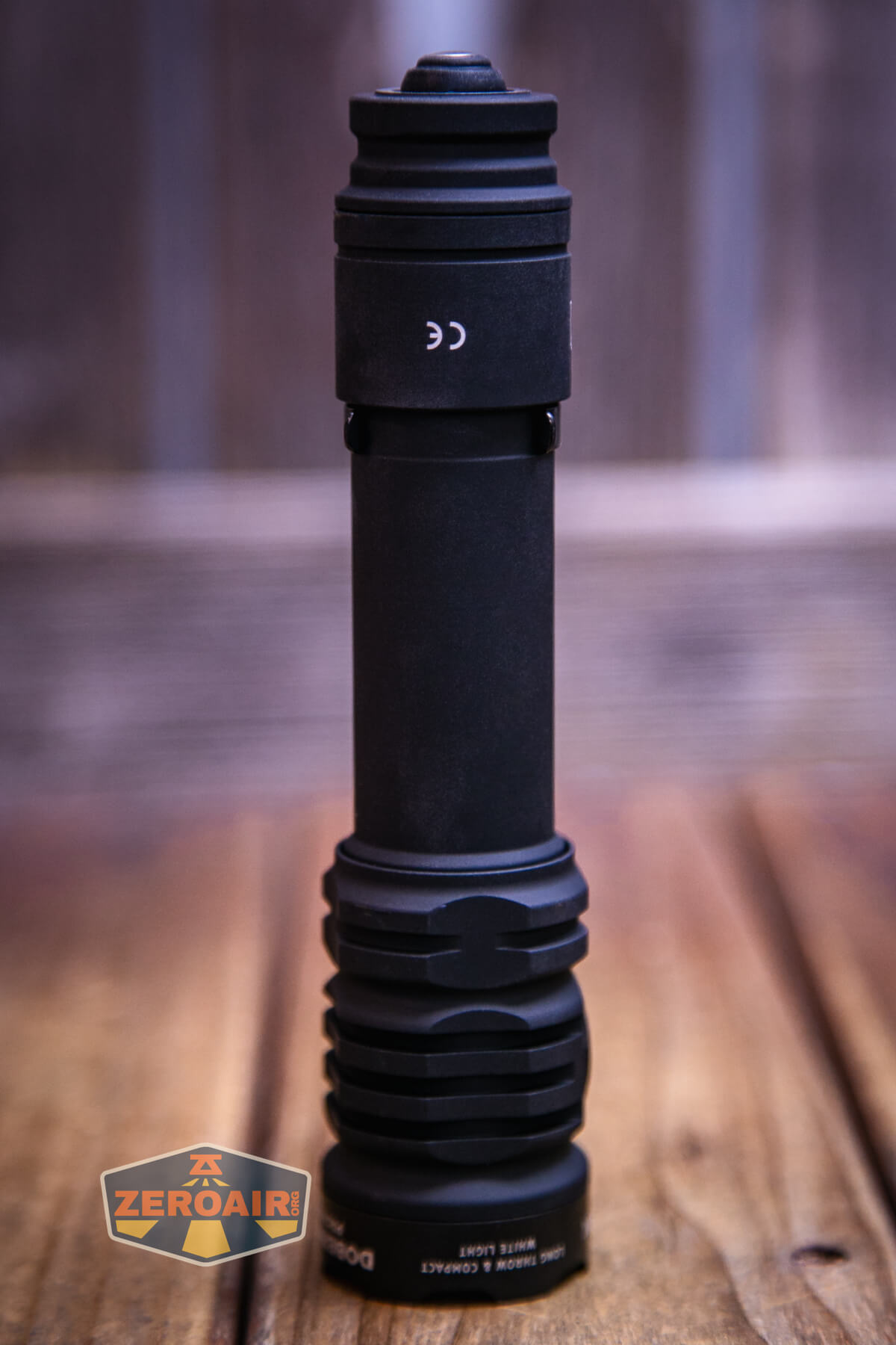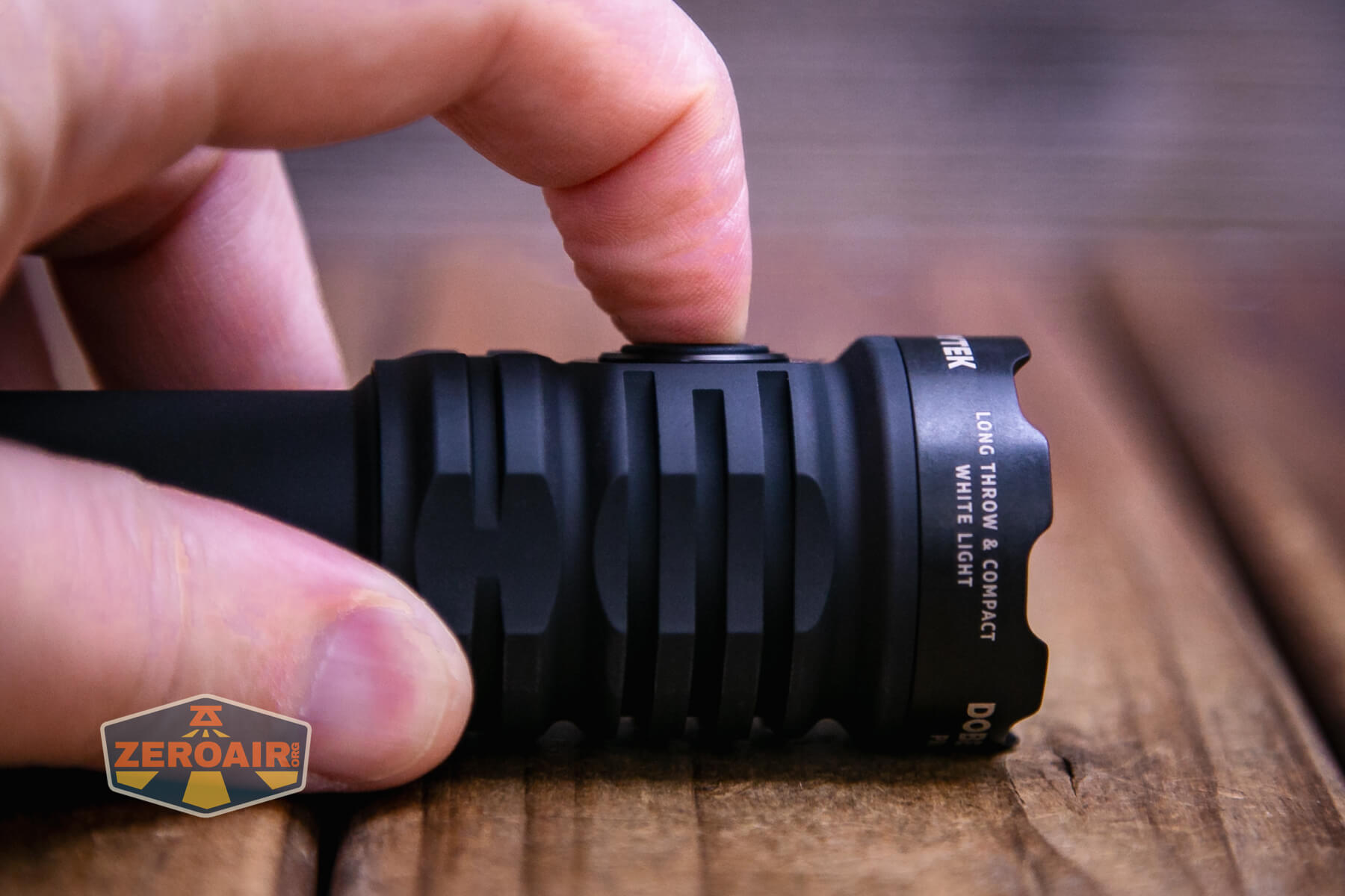 The Armytek Dobermann Pro Max tactical flashlight is controlled by a tail switch and a side e-switch, too. In fact, I think both the switches are e-switches.