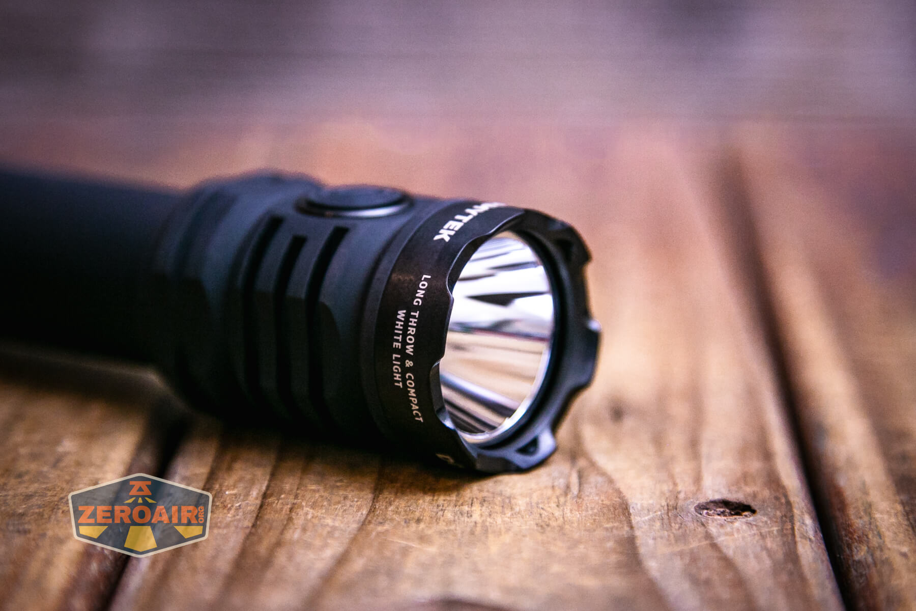 The Armytek Dobermann Pro Max tactical flashlight uses a Luminus SFT-70 emitter. That emitter has no dome, and the light has a smooth reflector, so as you might expect, the throw on this light is very high (high cd/lm, too!)