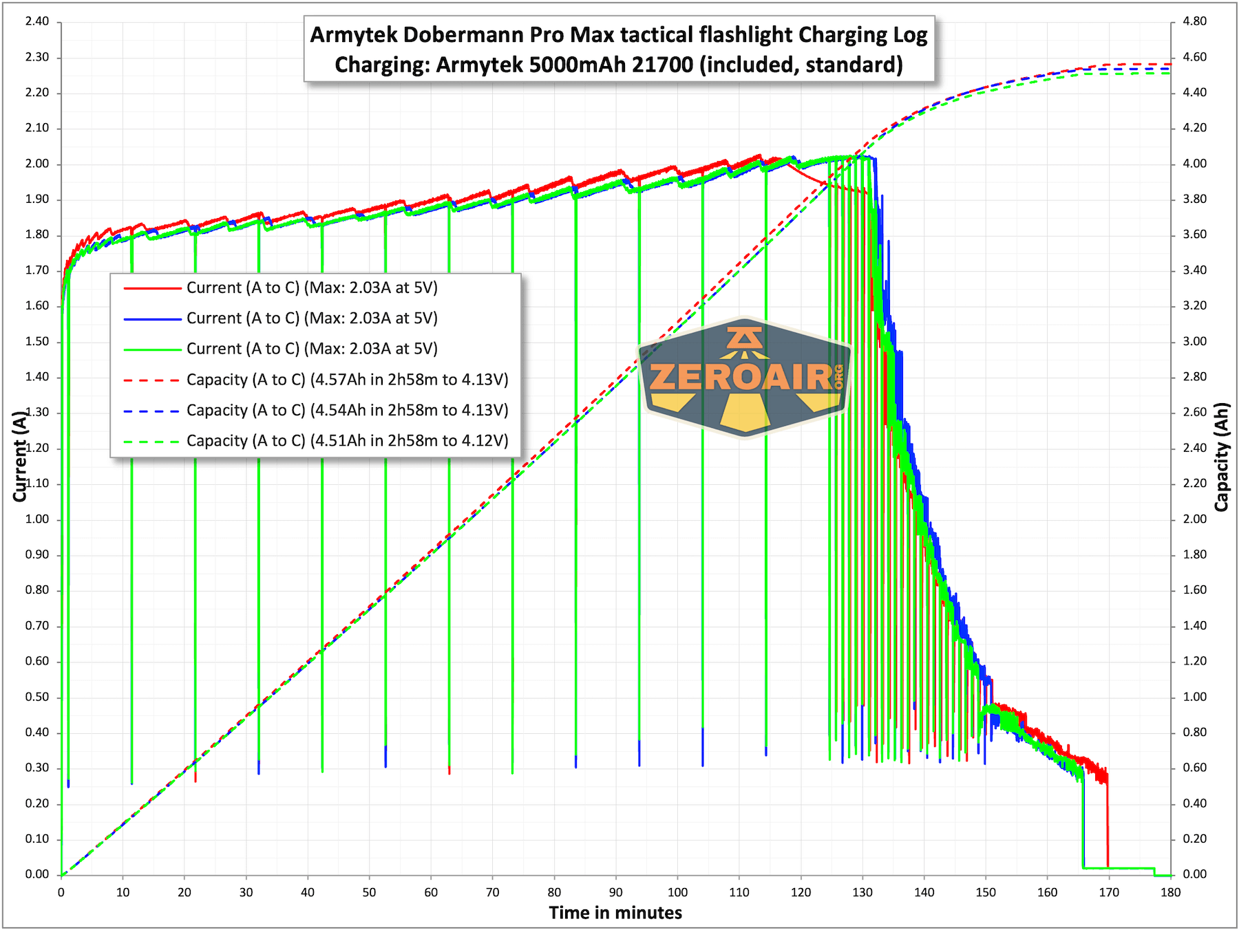 Charging takes around 3 hours and is moderately speedy, at around 2A (or 0.5C for this 5000mAh cell).