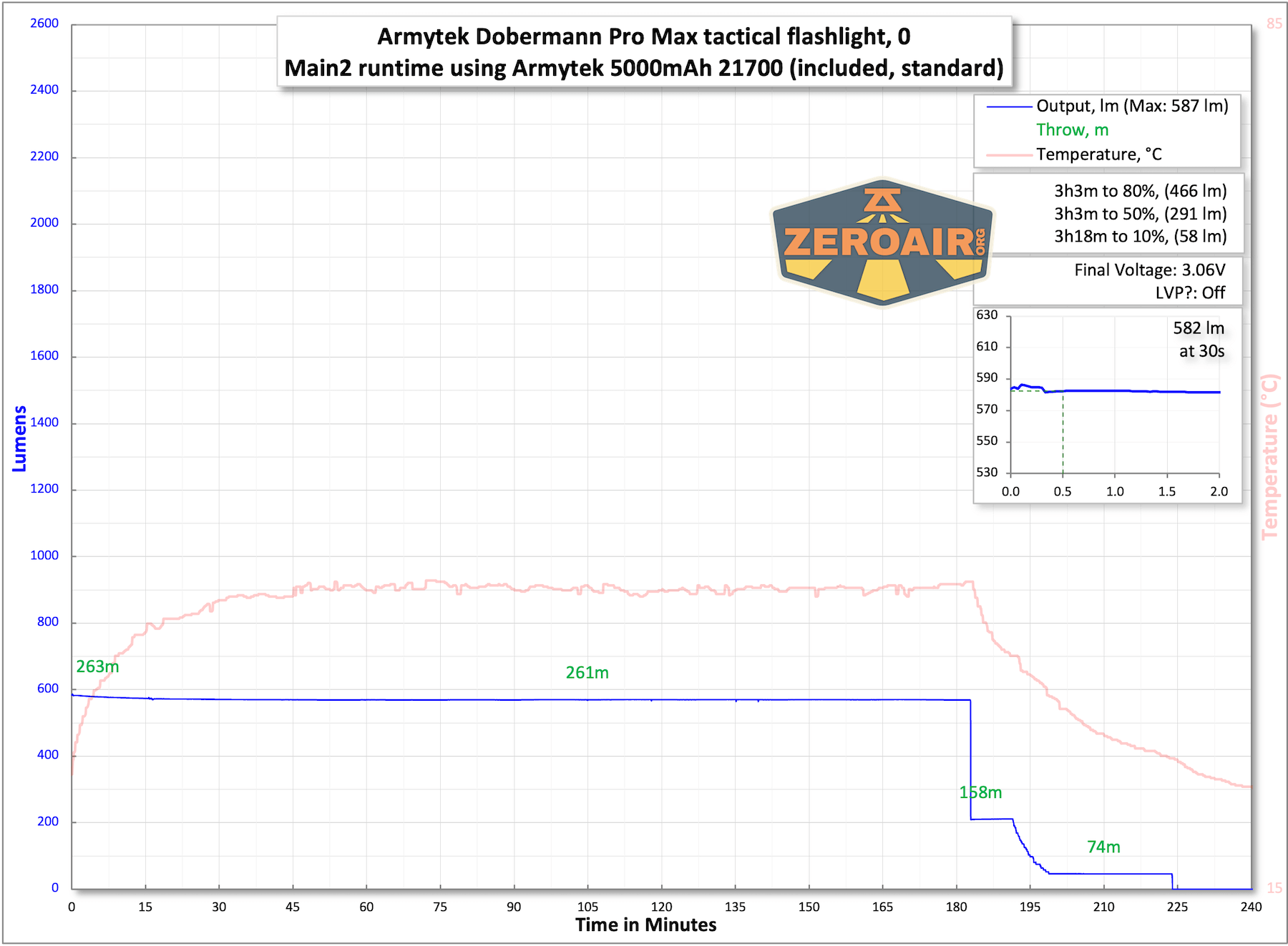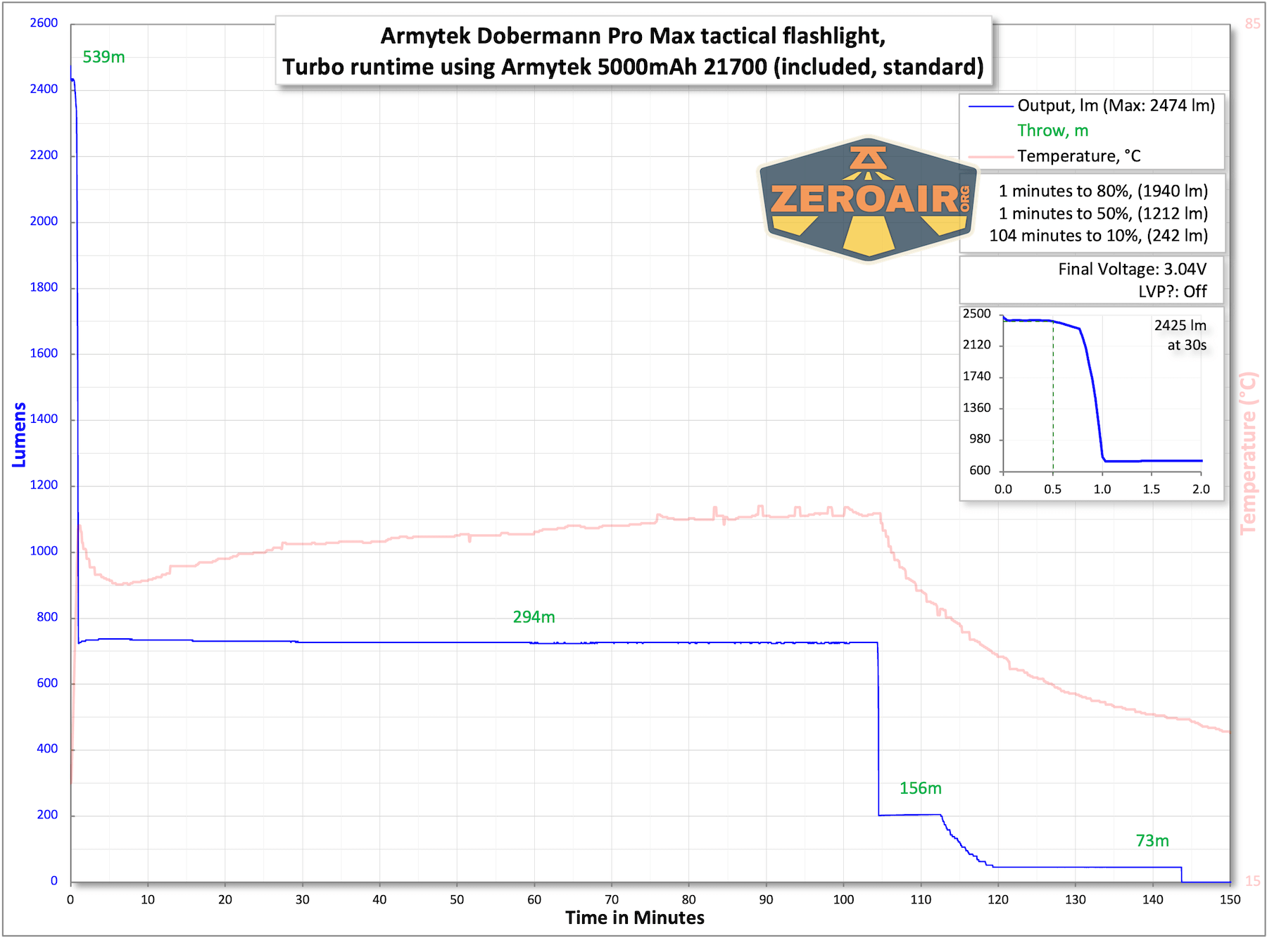 | Measured Lumens (at 30s) | 2425 (80.8% of claim)^ |