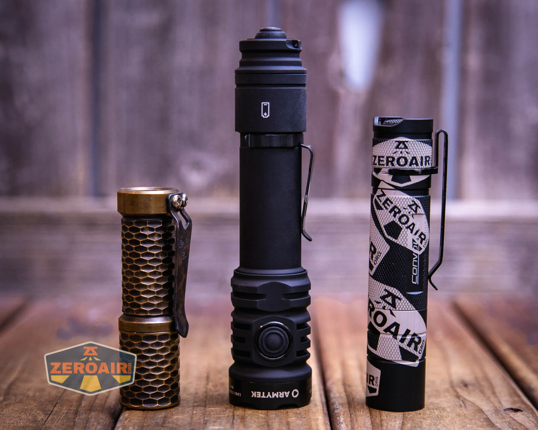 Also in the photo above, my Standard Reference Material (SRM) flashlight is the Hanko Machine Works Trident, an 18350 light. While I have not reviewed or tested the Gunner Grip version seen here, I have tested a Hanko Machine Works Trident Total Tesseract in brass. I love the Trident, and it’s a striking contrast to the inexpensive Convoy S2+, another great SRM.