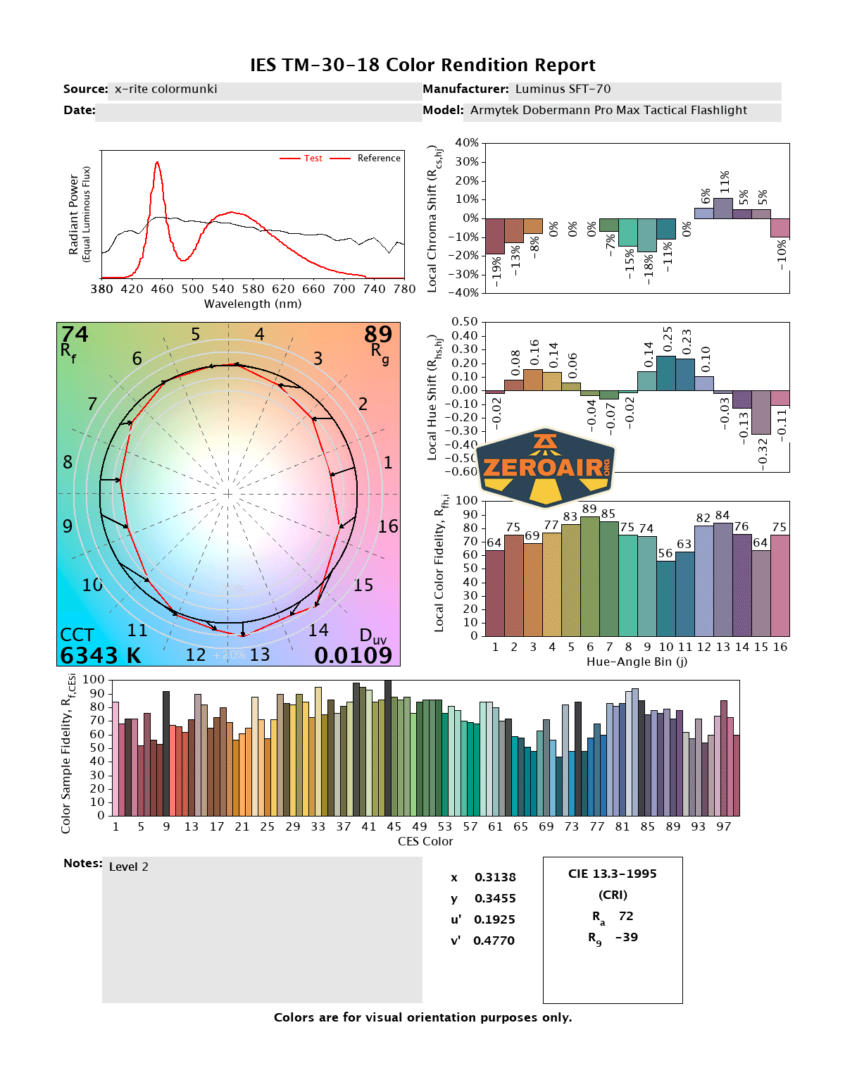 This light ranges from cool white to very cool white and has low CRI. The beam profile is very tight and throwy though, so we often forgive cool white low CRI output on tactical lights like this.