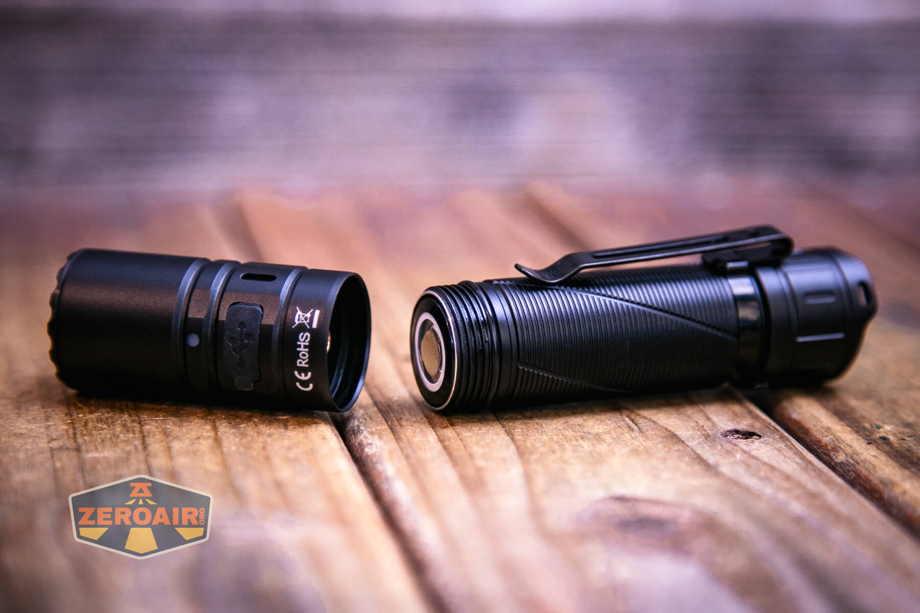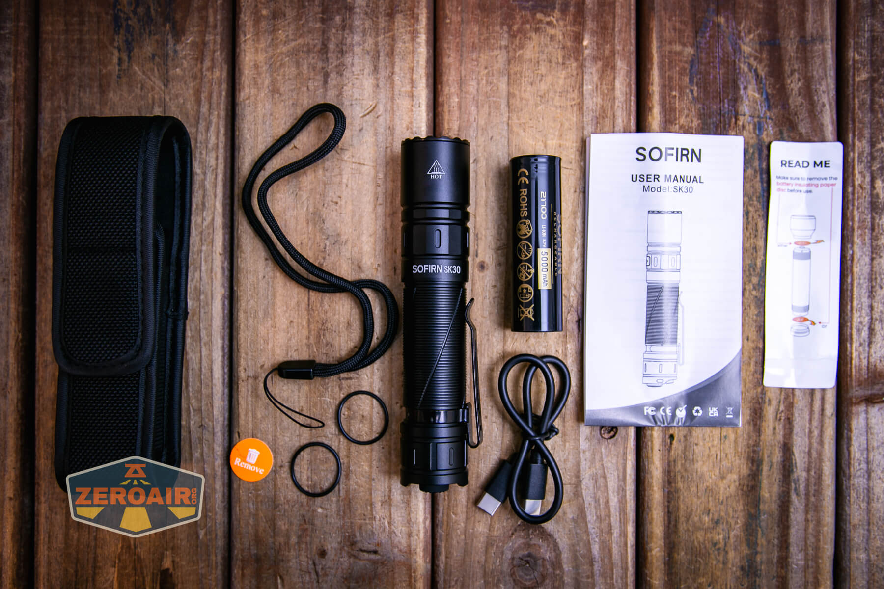The Sofirn SK30 tactical flashlight runs a single lithium-ion cell. It’s a 21700-sized light, and Sofirn includes a 5000mAh 21700.