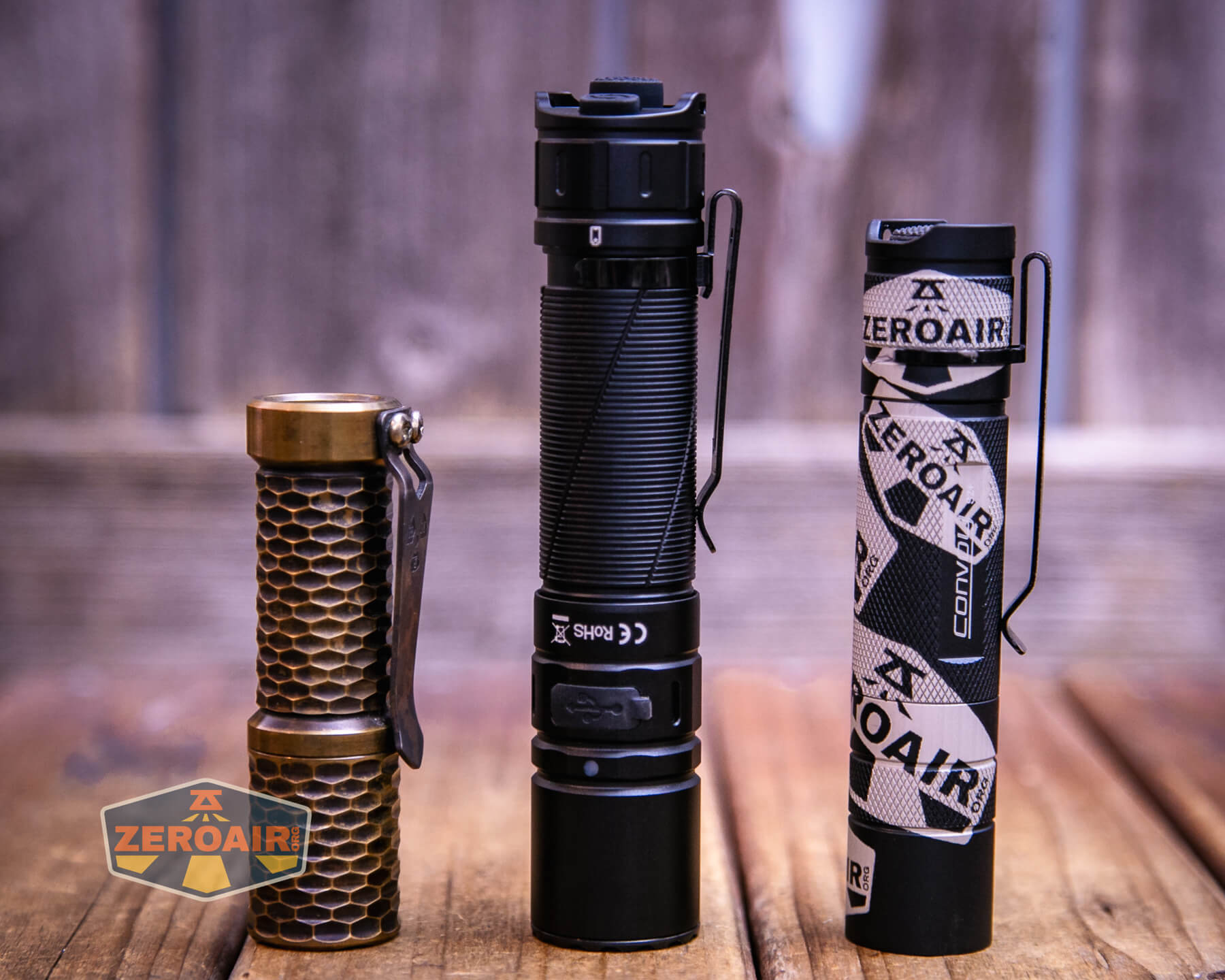 Also in the photo above, my Standard Reference Material (SRM) flashlight is the Hanko Machine Works Trident, an 18350 light. While I have not reviewed or tested the Gunner Grip version seen here, I have tested a Hanko Machine Works Trident Total Tesseract in brass. I love the Trident, and it’s a striking contrast to the inexpensive Convoy S2+, another great SRM.