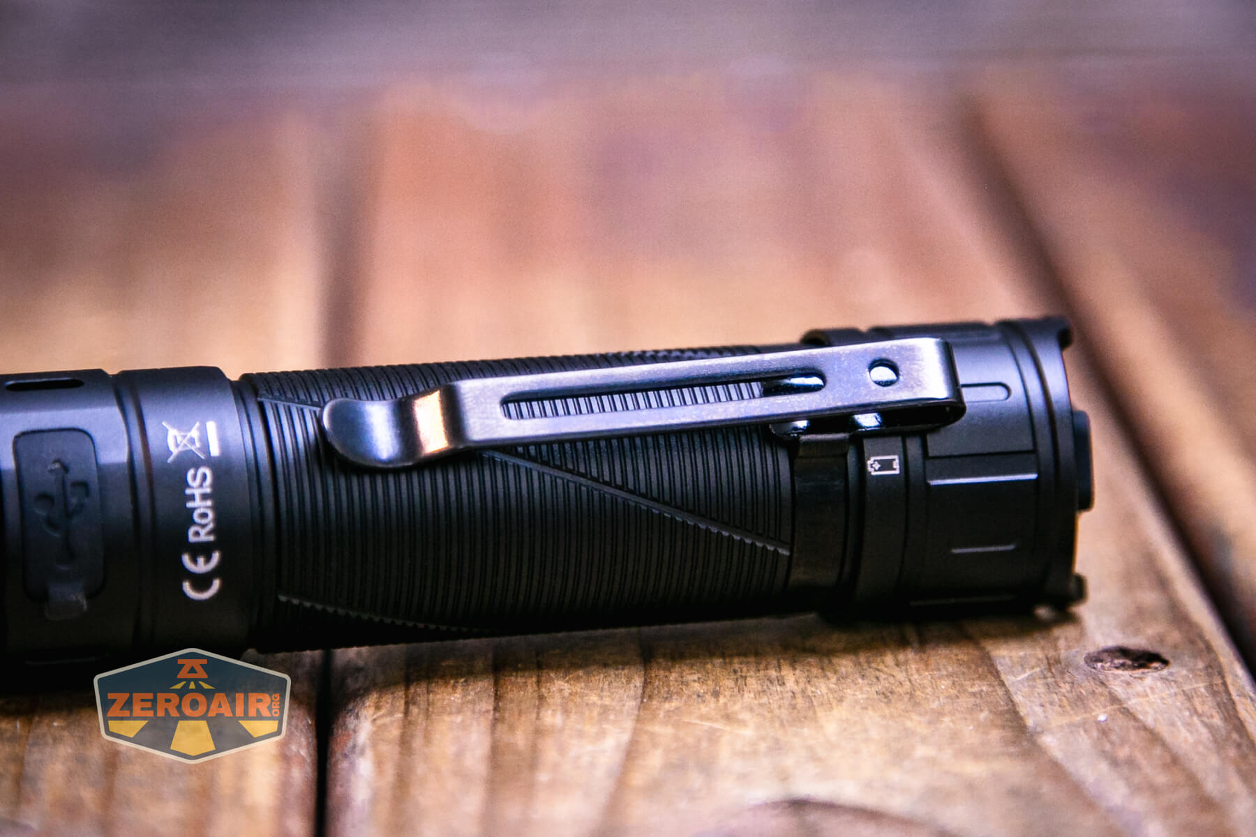 The pocket clip has a couple of holes where you could attach the included lanyard, but a better place is on the tailcap, where there are two options. (You can see that later.)