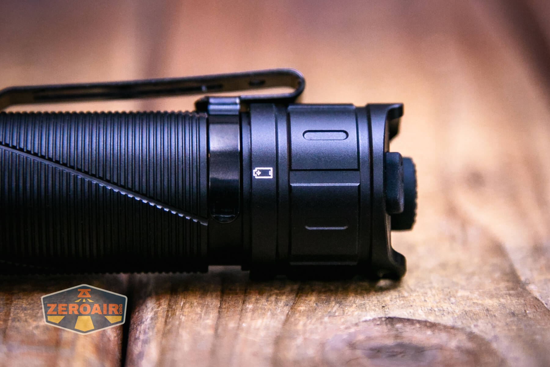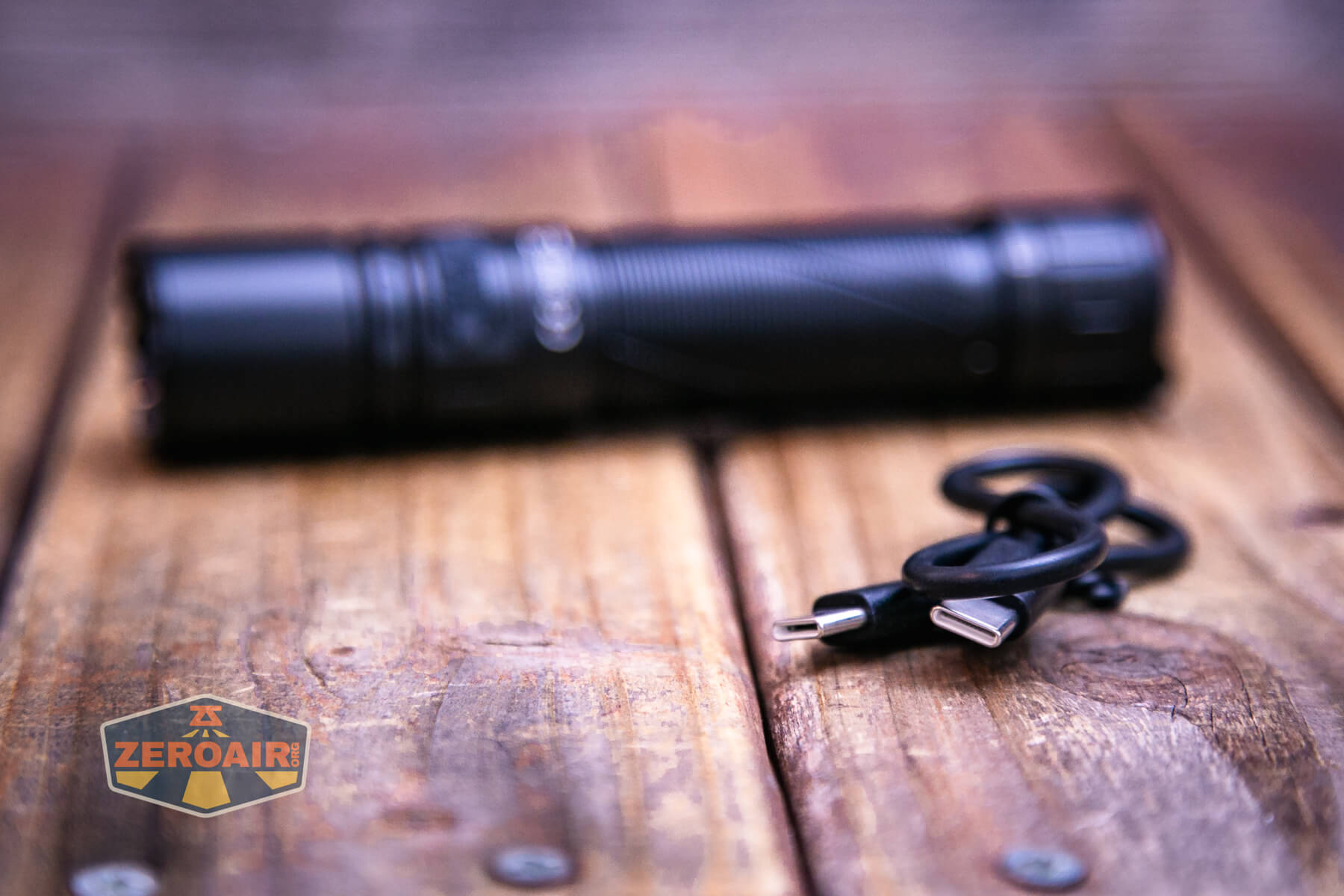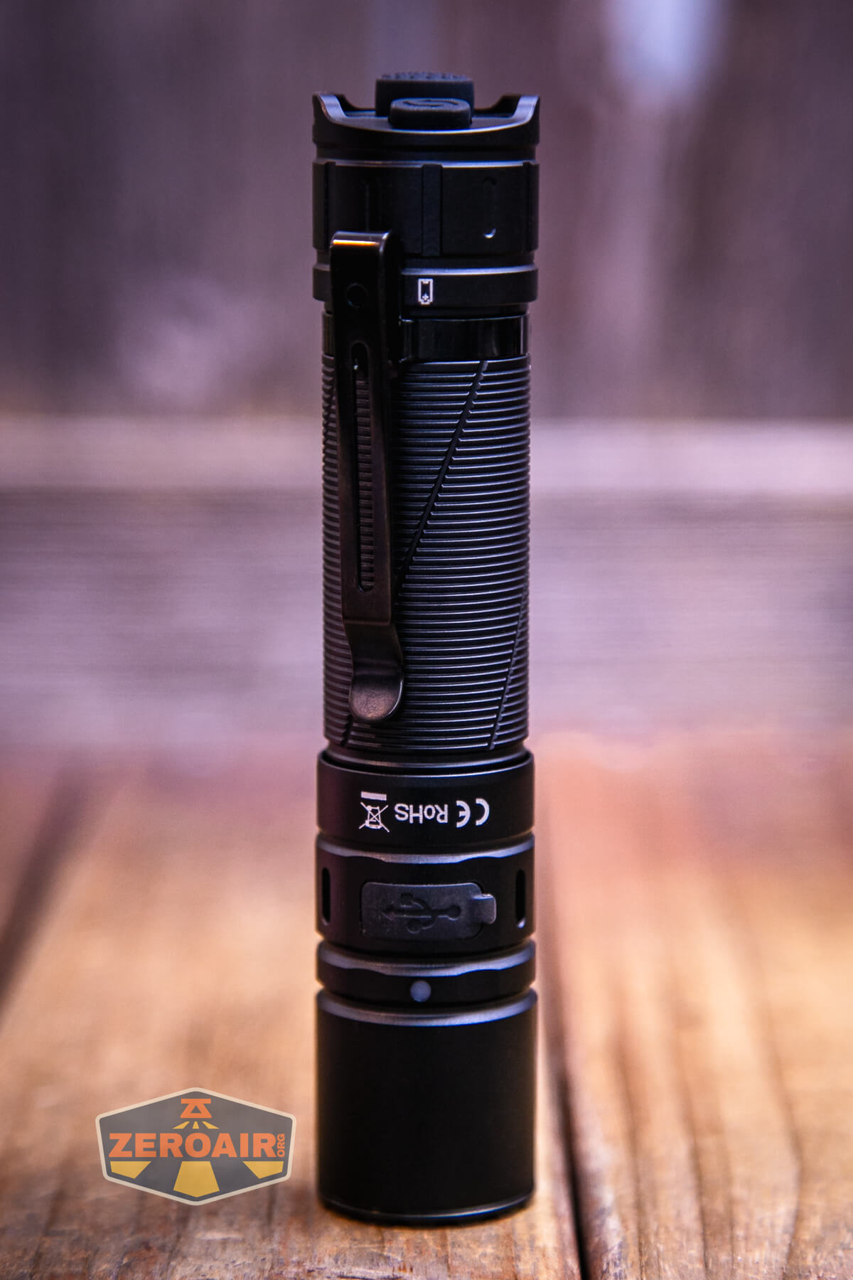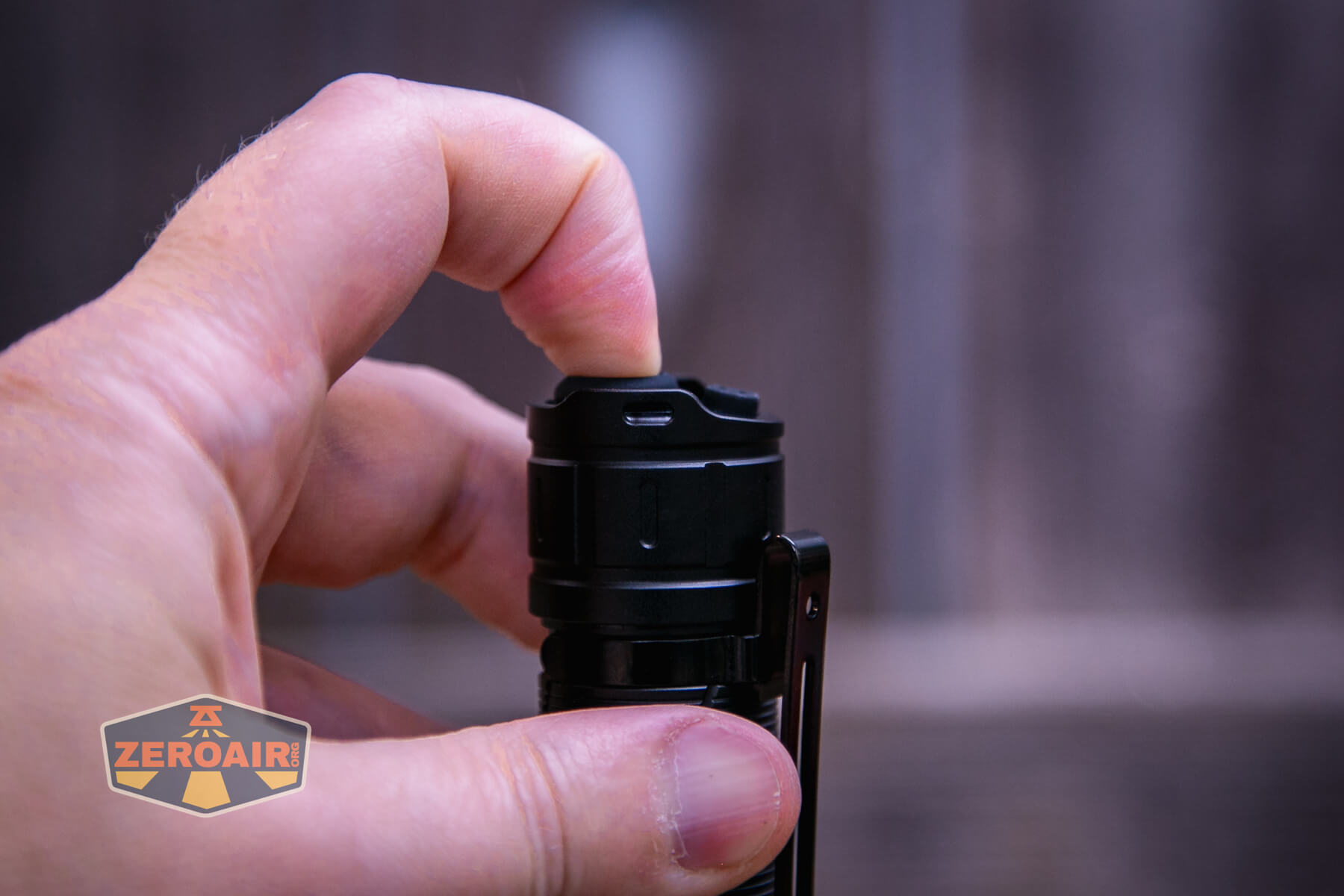 The Sofirn SK30 tactical flashlight offers USB-C charging on the head. There’s a press-in charge port cover.