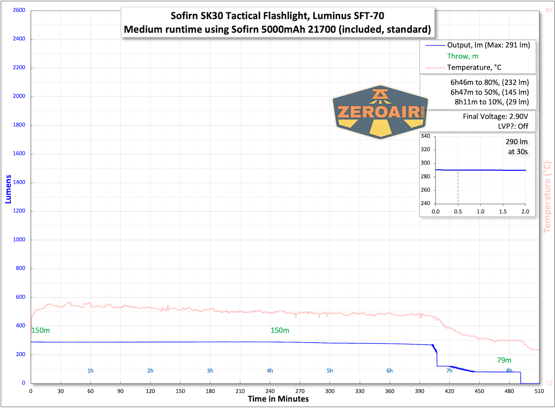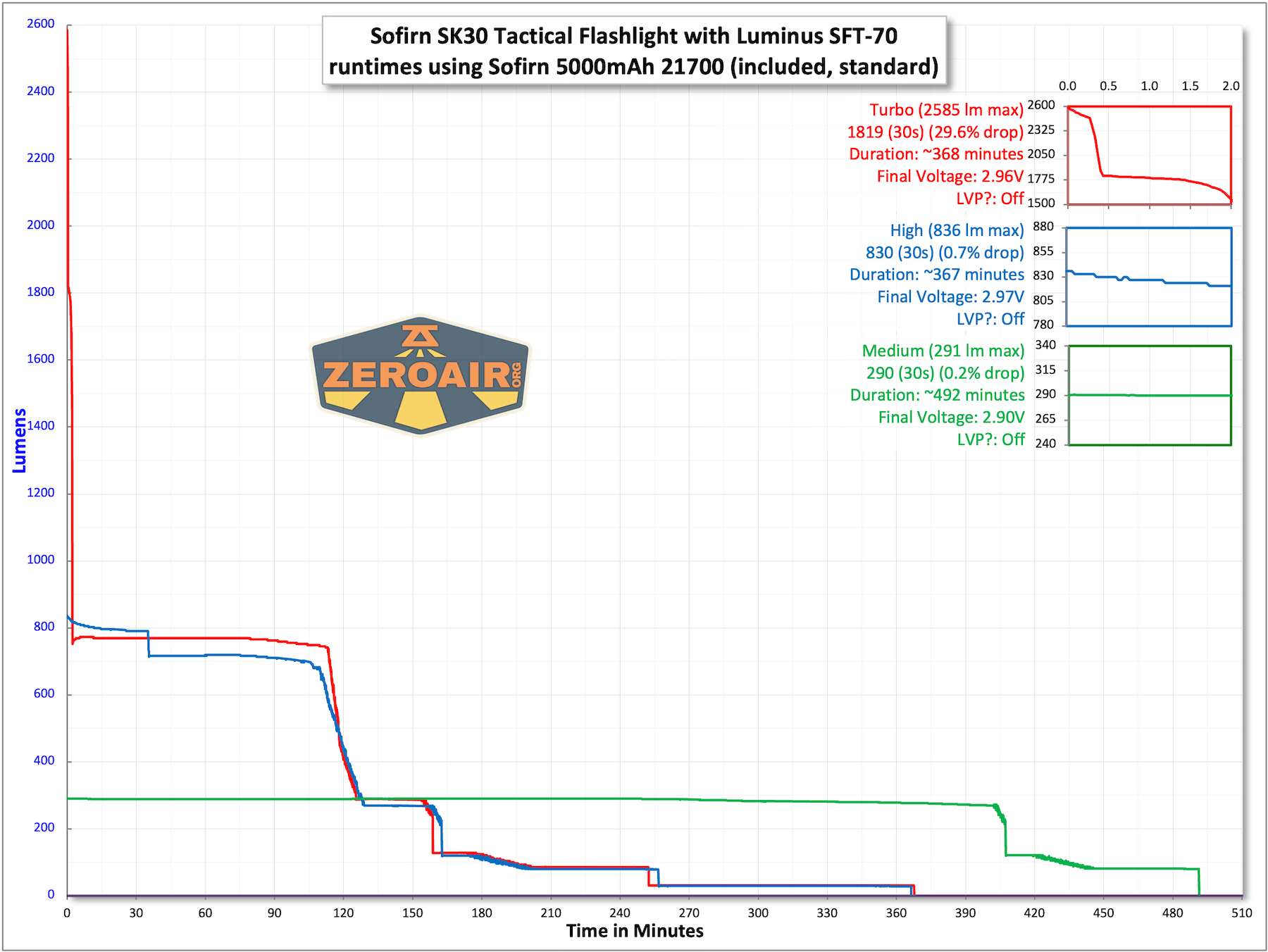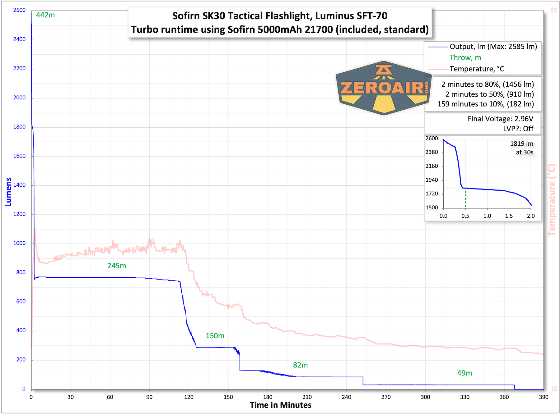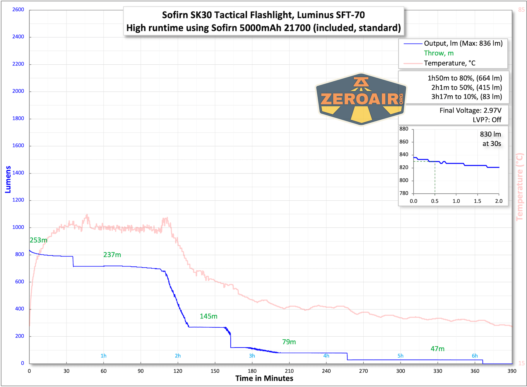 The Sofirn SK30 tactical flashlight seems like a fine light, but my copy really needs to work better. Activation is intermittent, but once it is on, it does tend to stay on (as shown in the runtime tests). Performance is fairly good, even though it doesn’t seem to hit the 3000-lumen claim. I like the user interface, as it doesn’t require a double click to get to Turbo, and when in turbo, clicking “out” of Turbo is unlike other recent Sofirns (which click out of turbo to High, THEN you can click the light off. I do note a bit of price creep, too, with the sale price being over $45. Still, if you need a throwy tactical light, a good copy of this one will do just fine.