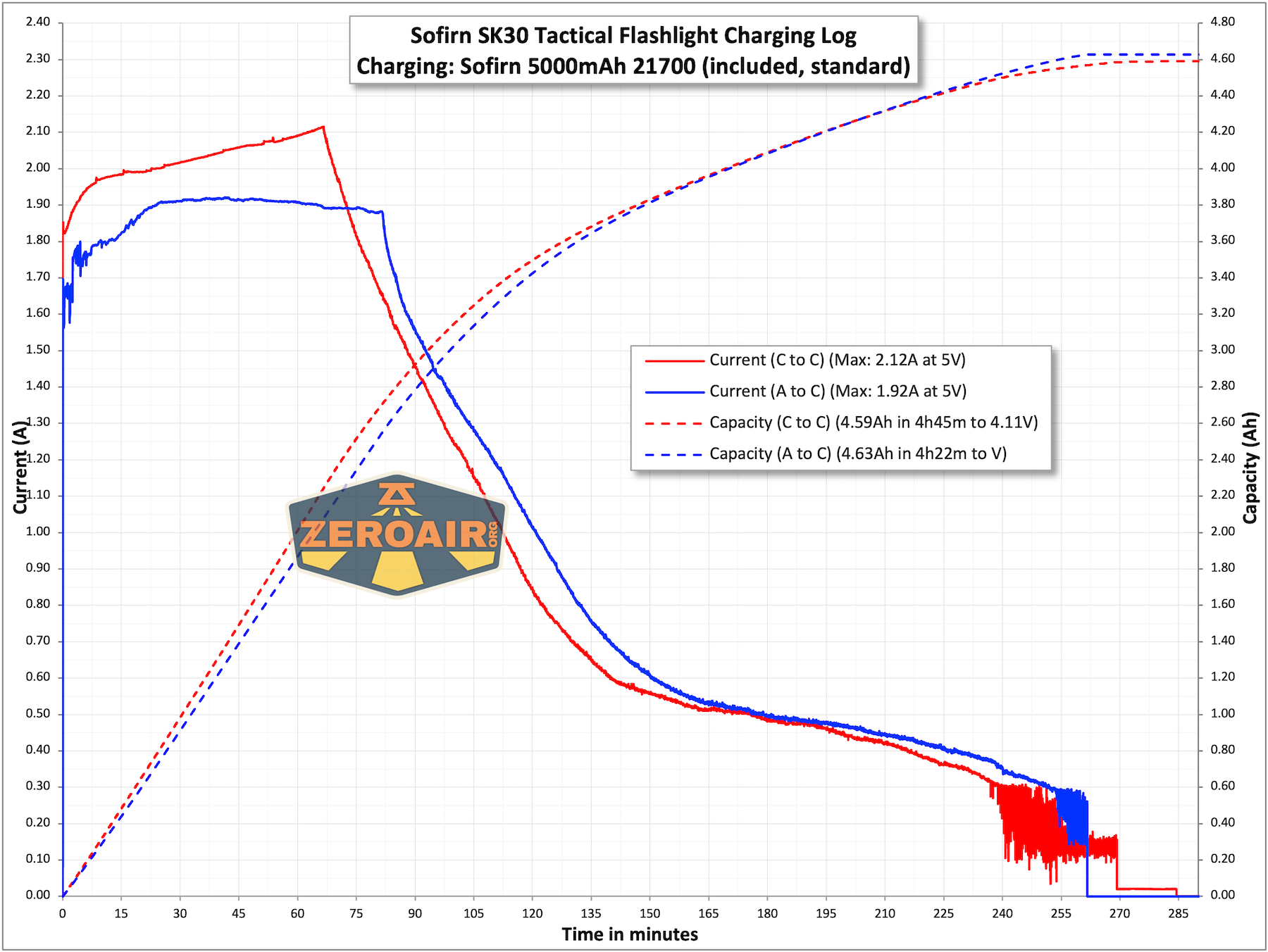 Charging is fine, peaking at around 2A, but then drifting off for quite a while before finally terminating. So the total time is nearly 5 hours, but the CC (constant current) phase only lasts around 1.5 hours.