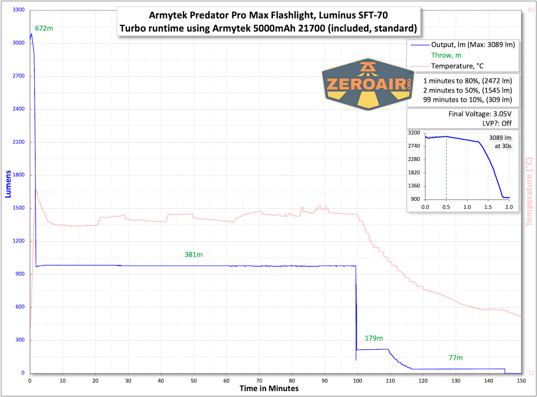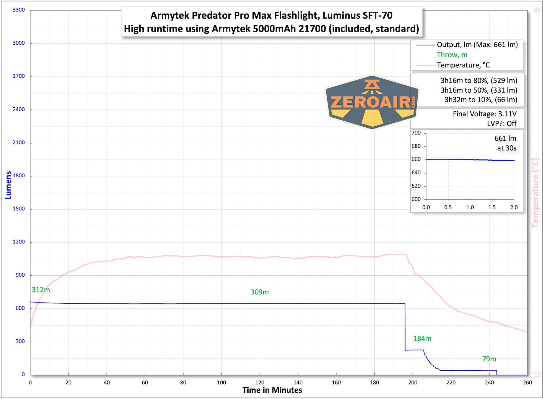 Below are a few runtime tests. Output is nice and high for around a minute, then steps down. High holds very steady even at the initial output, though.