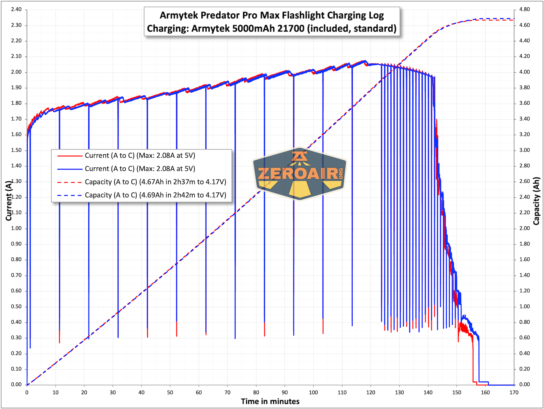 Charging takes around 3 hours and is moderately speedy, at around 2A (or 0.5C for this 5000mAh cell).
