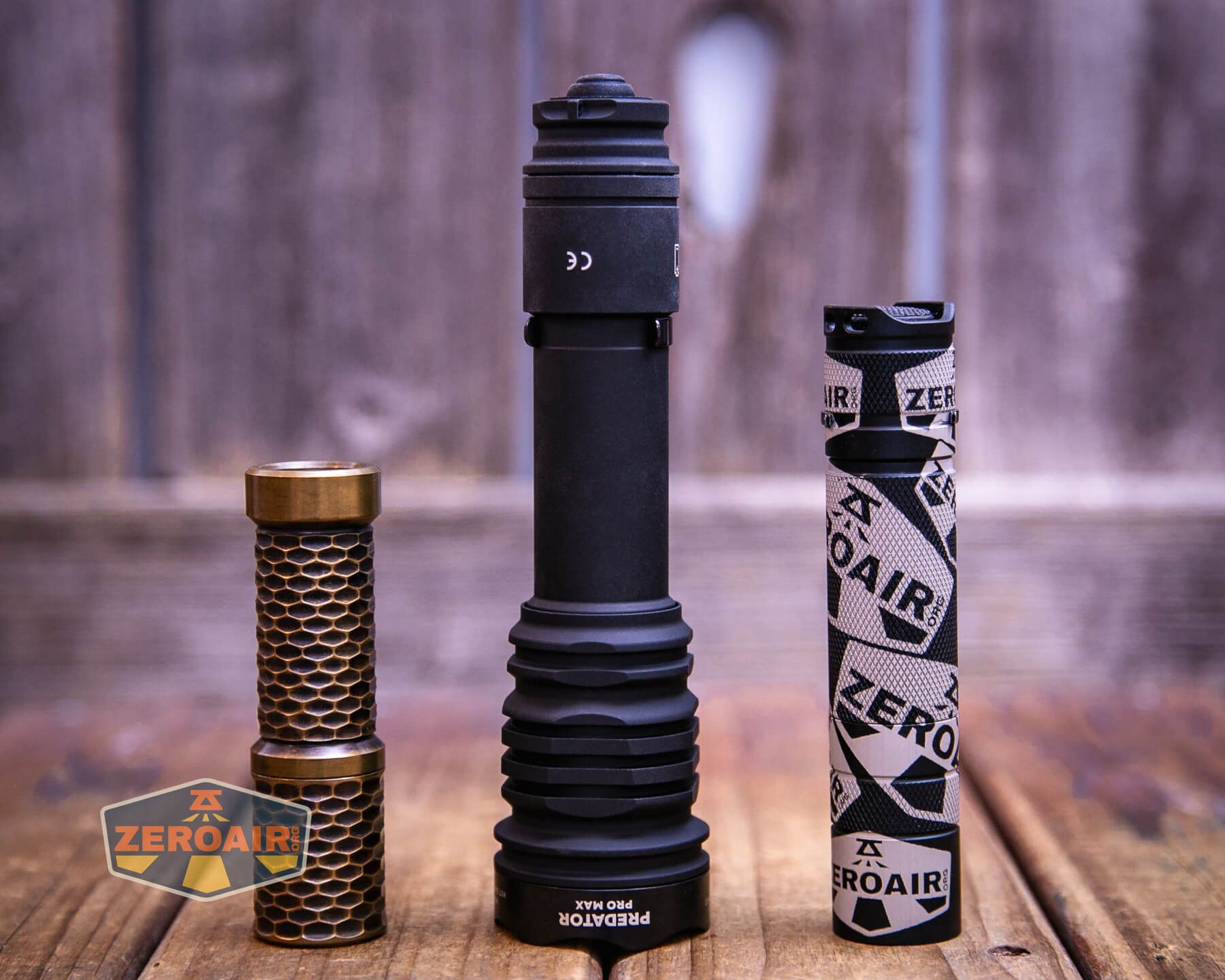 Also in the photo above, my Standard Reference Material (SRM) flashlight is the Hanko Machine Works Trident, an 18350 light. While I have not reviewed or tested the Gunner Grip version seen here, I have tested a Hanko Machine Works Trident Total Tesseract in brass. I love the Trident, and it’s a striking contrast to the inexpensive Convoy S2+, another great SRM.