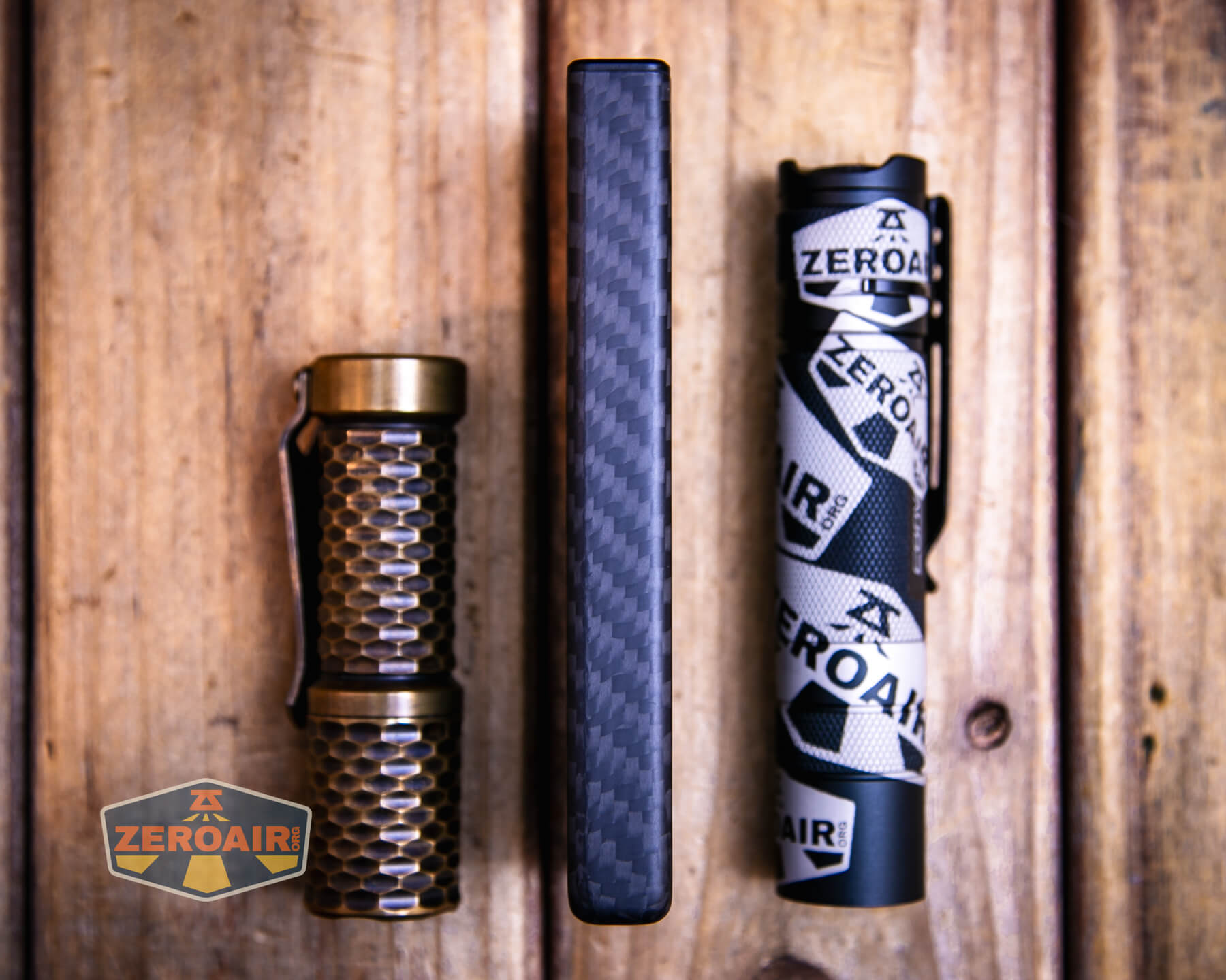 It’s a very slim size. Here it is compared to a couple of familiar flashlights: