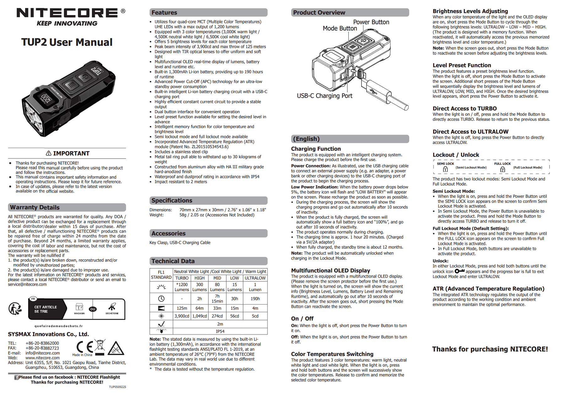 - Nitecore TUP2 rechargeable keychain flashlight