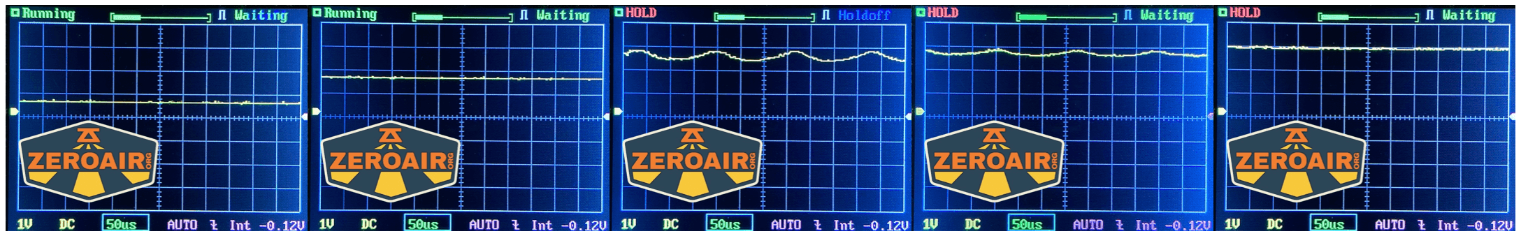 Then there’s the Ultrafire WF-602C flashlight, which has some of the worst PWM I’ve seen. It’s so bad that I used a post about it to explain PWM! Here are multiple timescales (10ms, 5ms, 2ms, 1ms, 0.5ms, 0.2ms) to make comparing this “worst” PWM light to the test light easier. That post also explains why I didn’t test the WF-602C at the usual 50us scale.