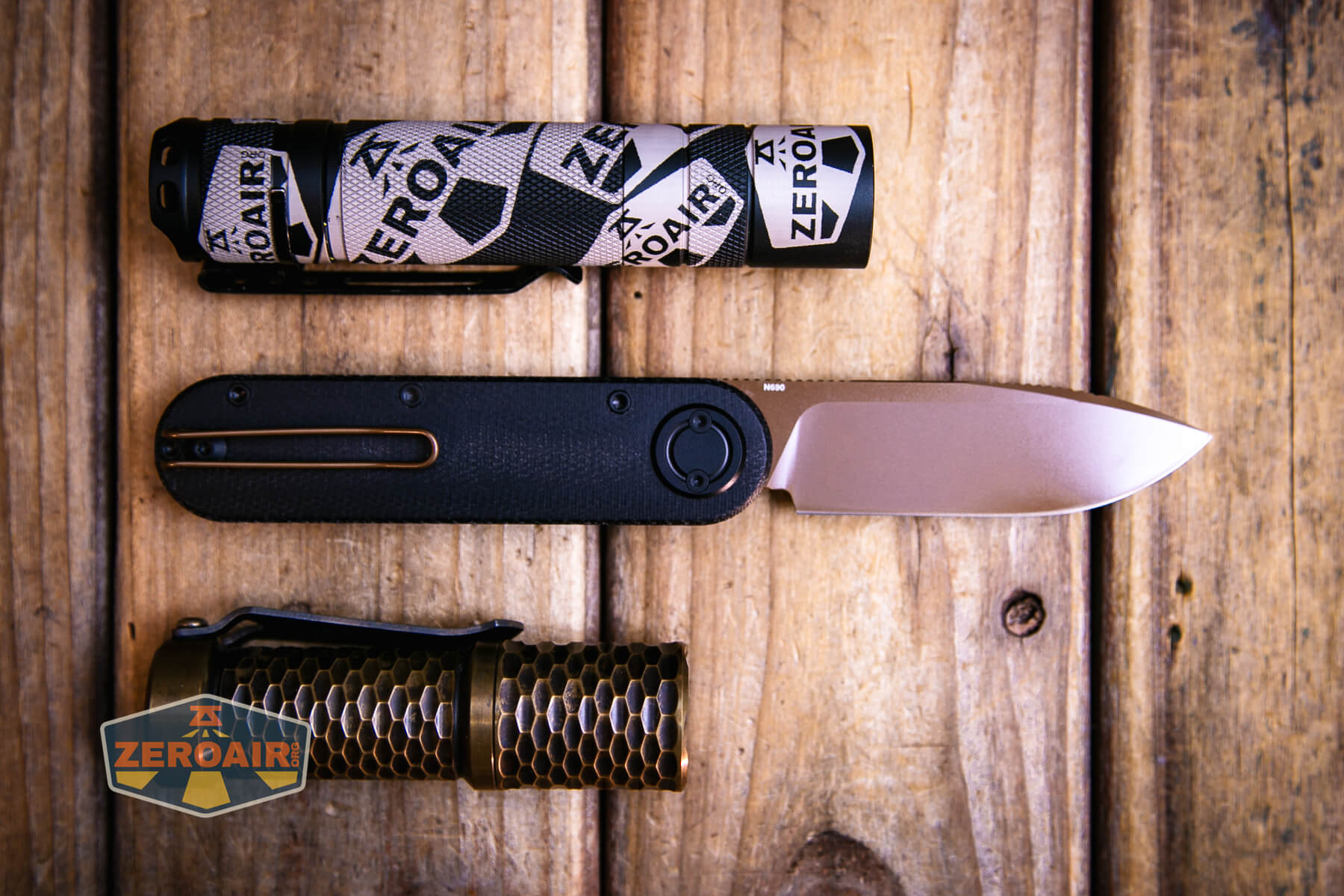 Below you can see the Vosteed Corgi V 295 Vanchor lock knife with the venerable Convoy S2+. The version below is a custom laser-engraved Convoy S2+ host by GadgetConnections.com. I did a full post on an engraved orange host right here! Or go straight to GadgetConnections.com to buy your Convoy S2+ now!