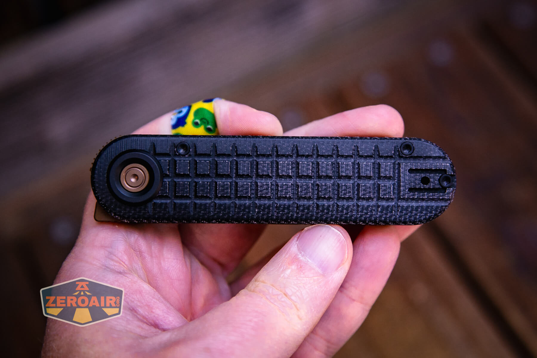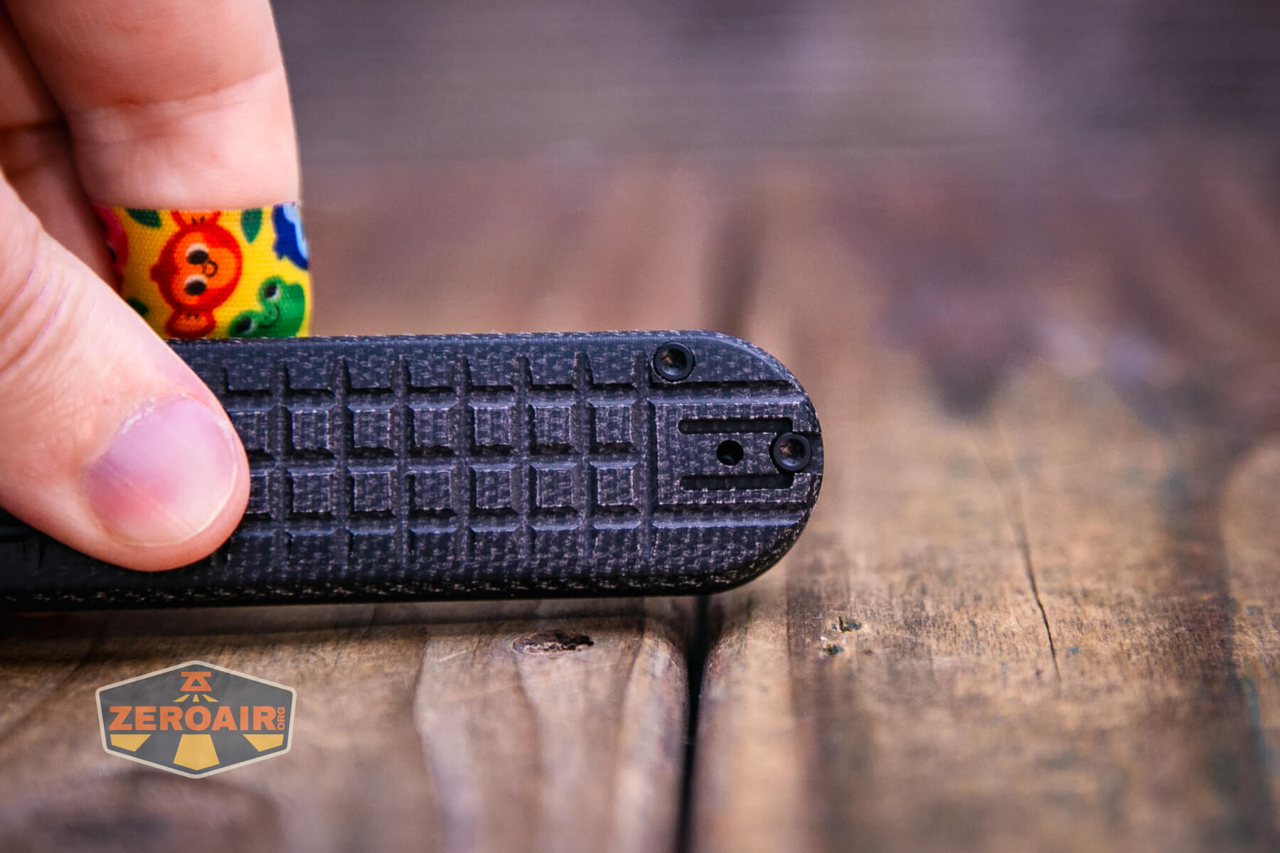 One side of the scales (above) is flat, but the reverse has a frag pattern milled into the Micarta.