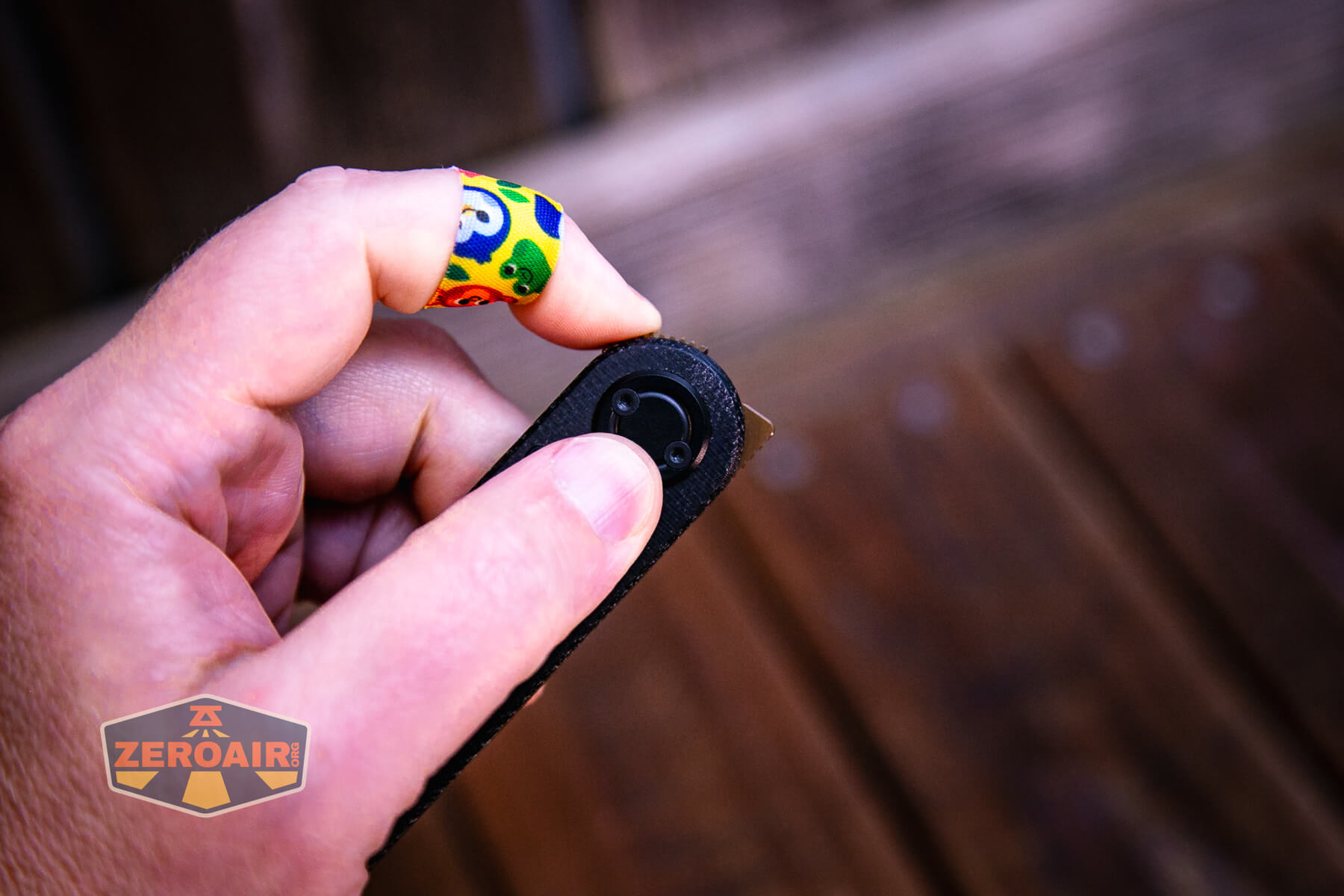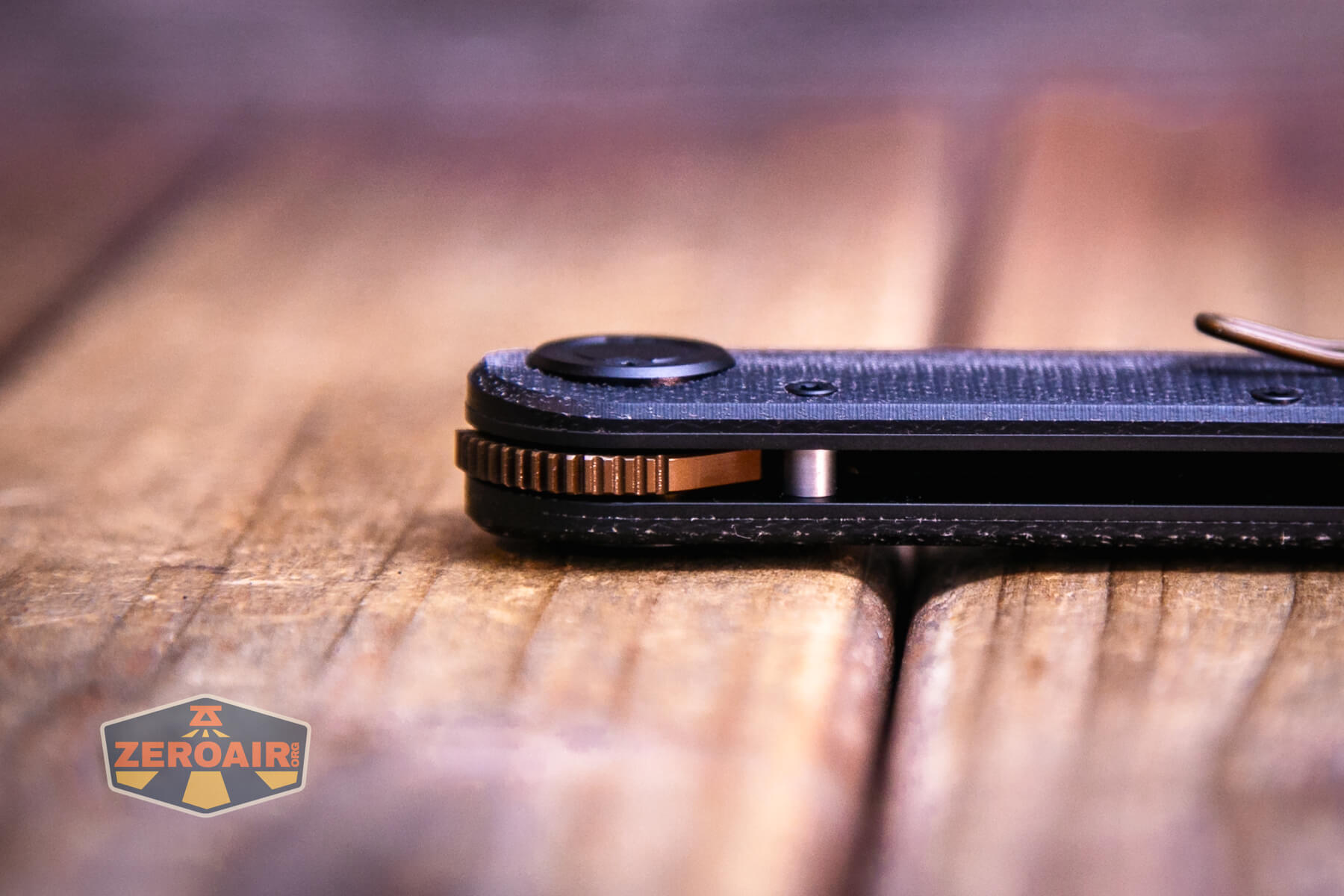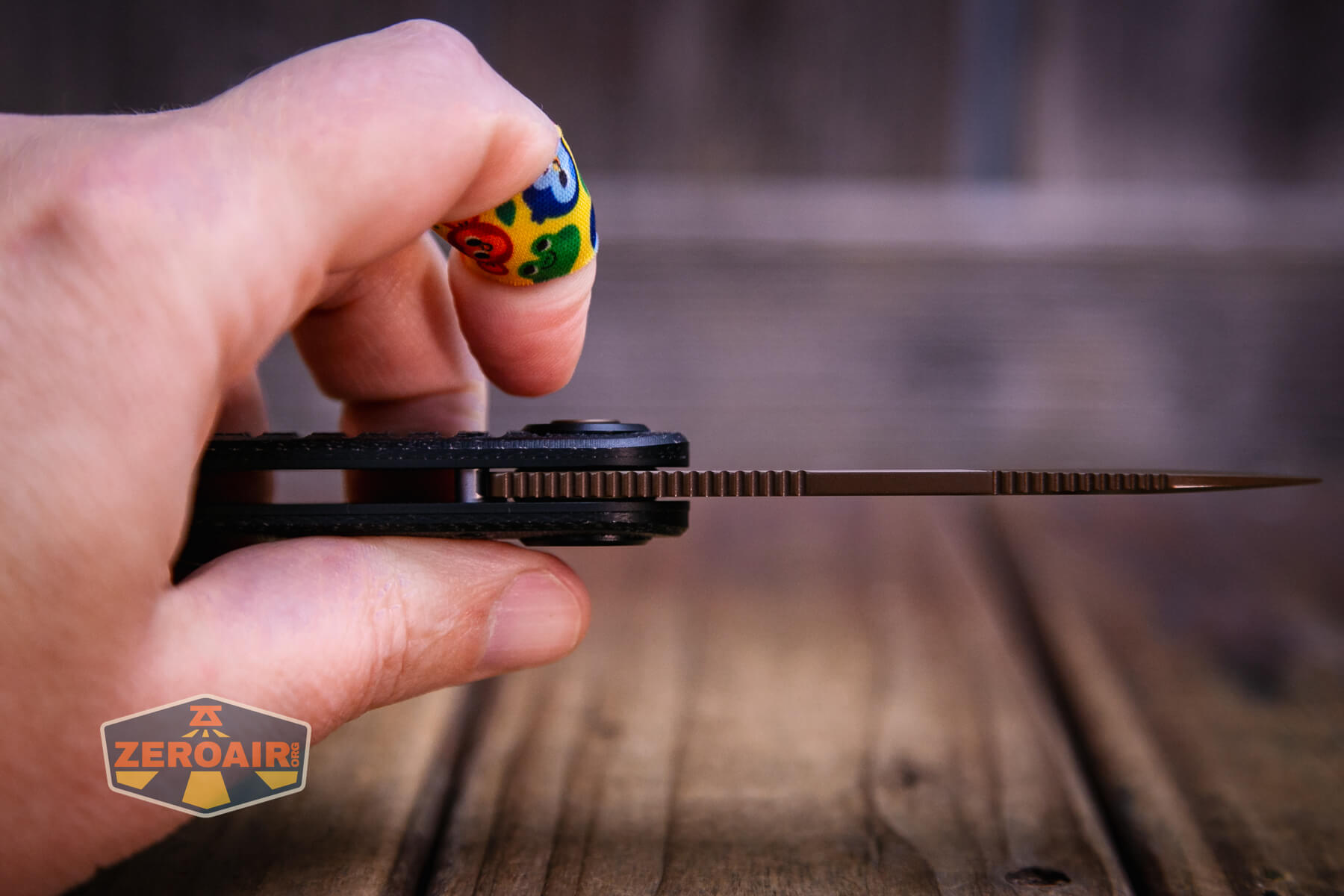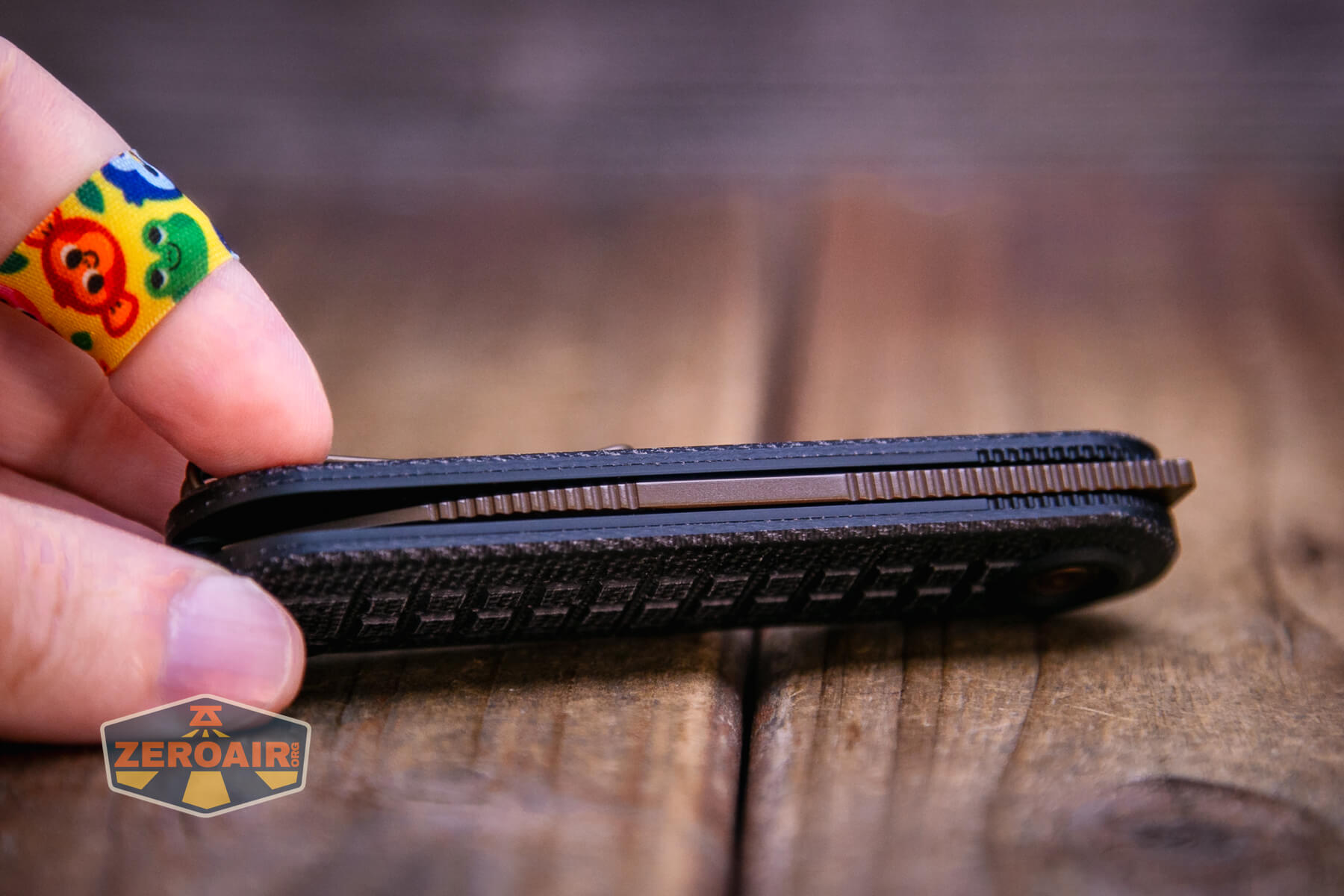 It’s also possible to flip with the “flipper tab,” but you’ll more likely use your thumb for that option. (This is my least favorite option for any knife!)