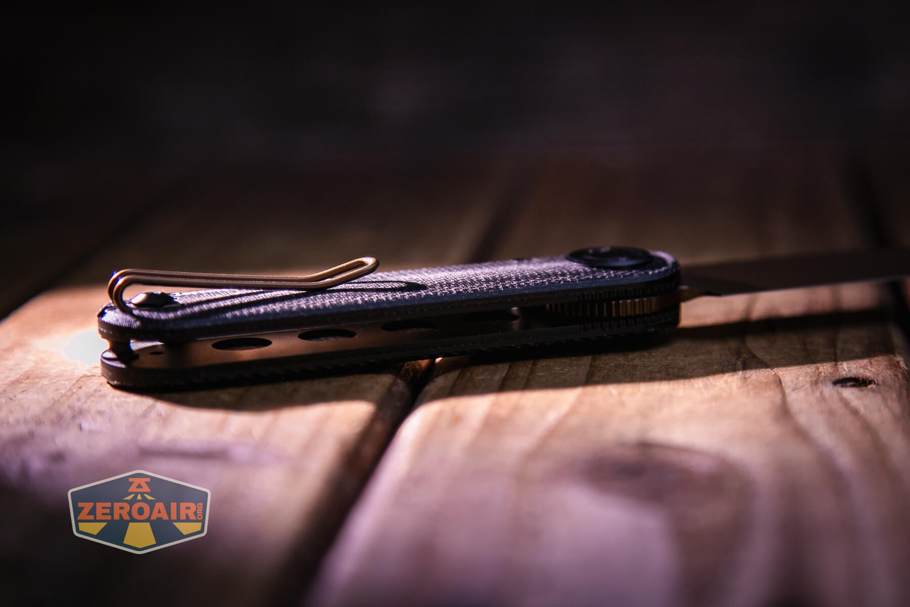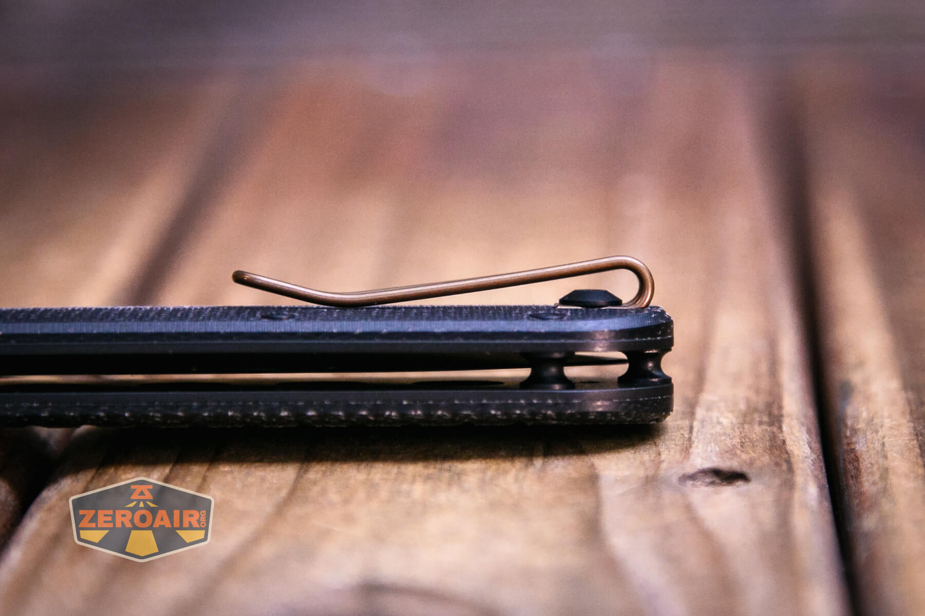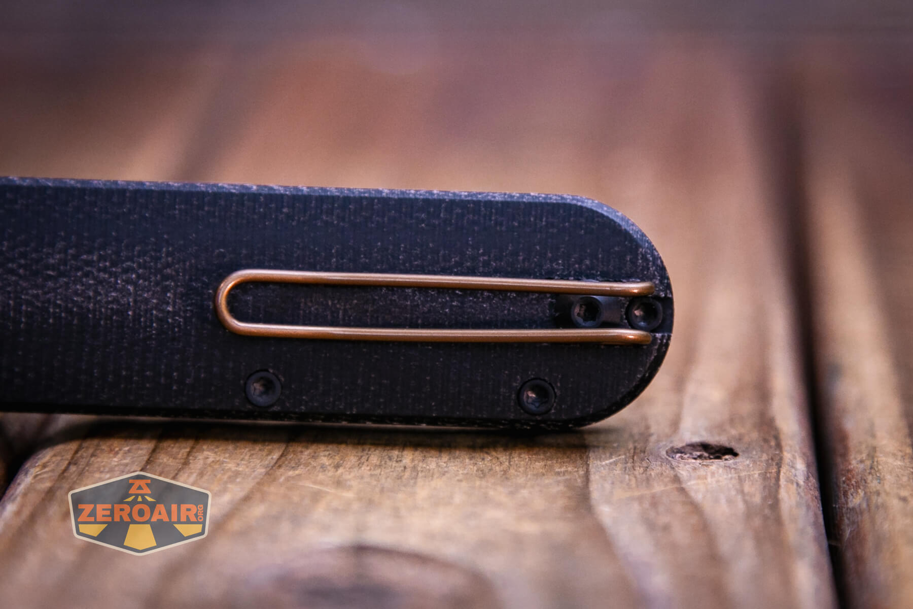 The Vosteed Corgi V 295 Vanchor lock knife uses a bent-wire (or “paperclip”) style pocket clip.