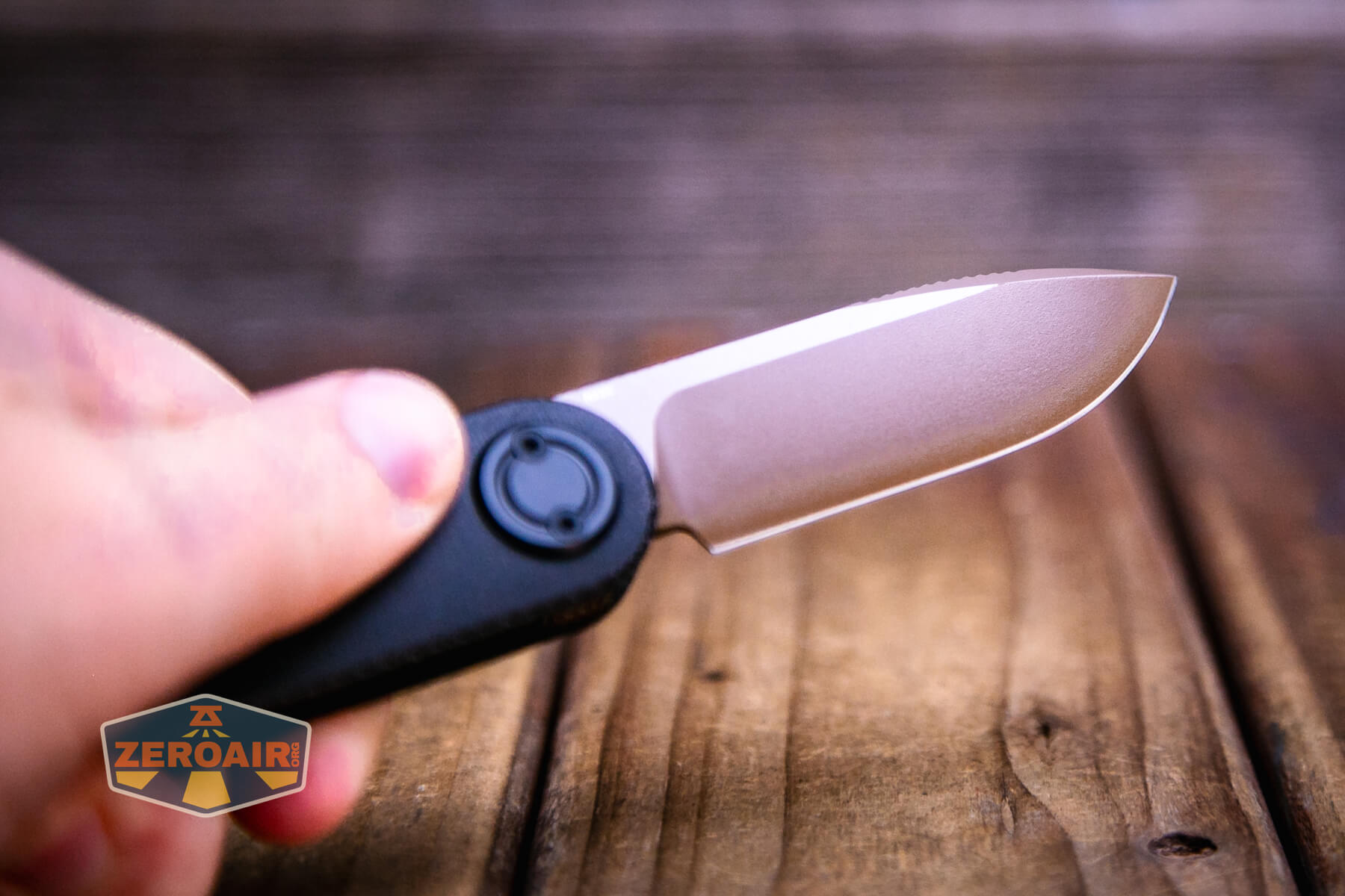 Notably, the button has action on one side only. But since you’ll squeeze the button (and less “press” the button), you can do this with either hand. Thus, flipping the Vosteed Corgi V 295 Vanchor lock knife open is the most simple opening option, and also ambidextrous.