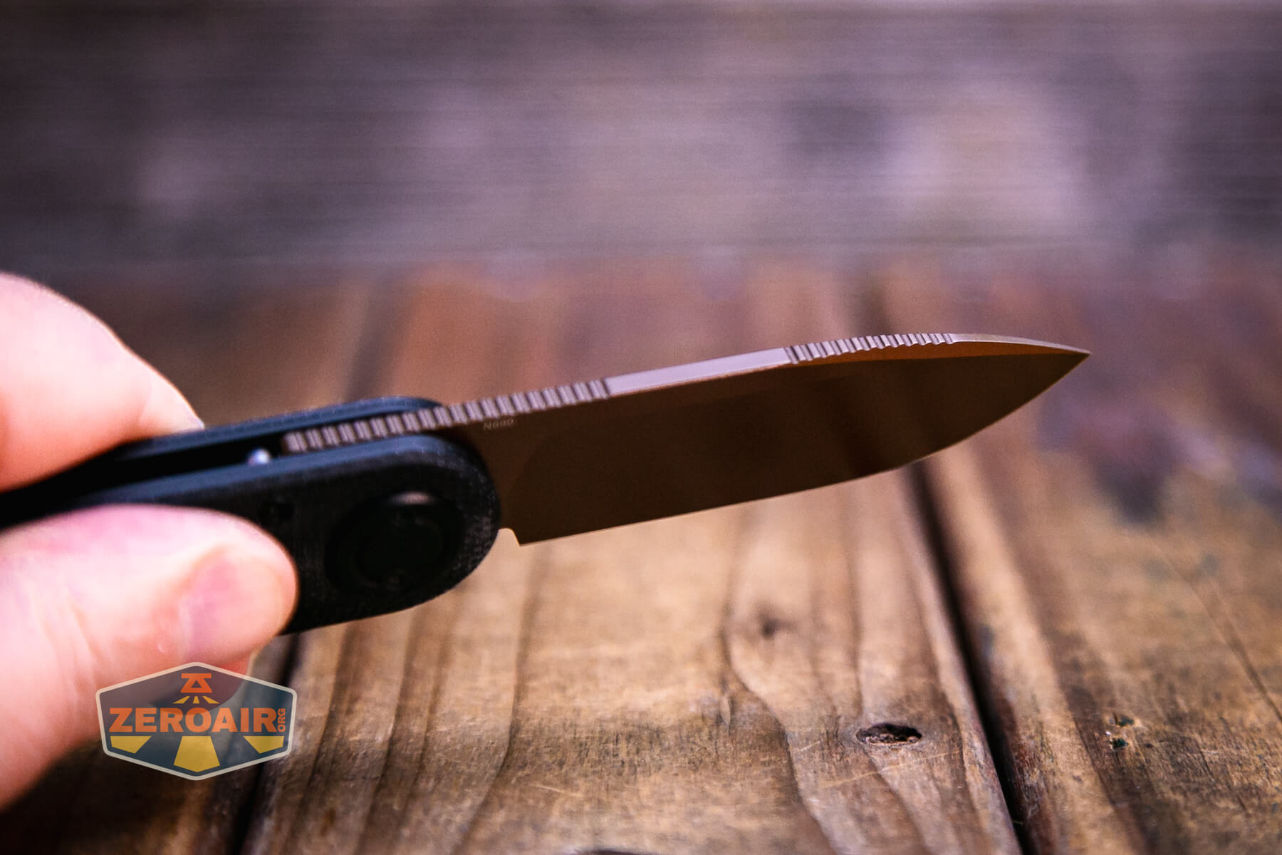 The blade offers a flat grind and, in this case, a “Copper dune” color coating.