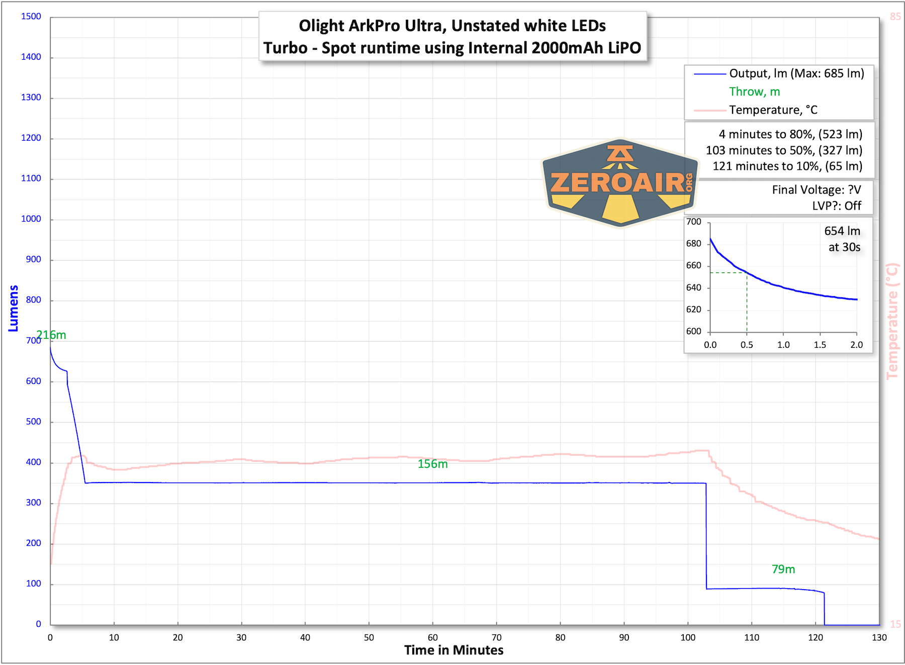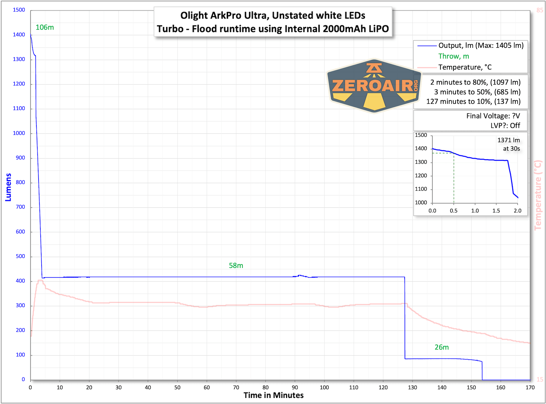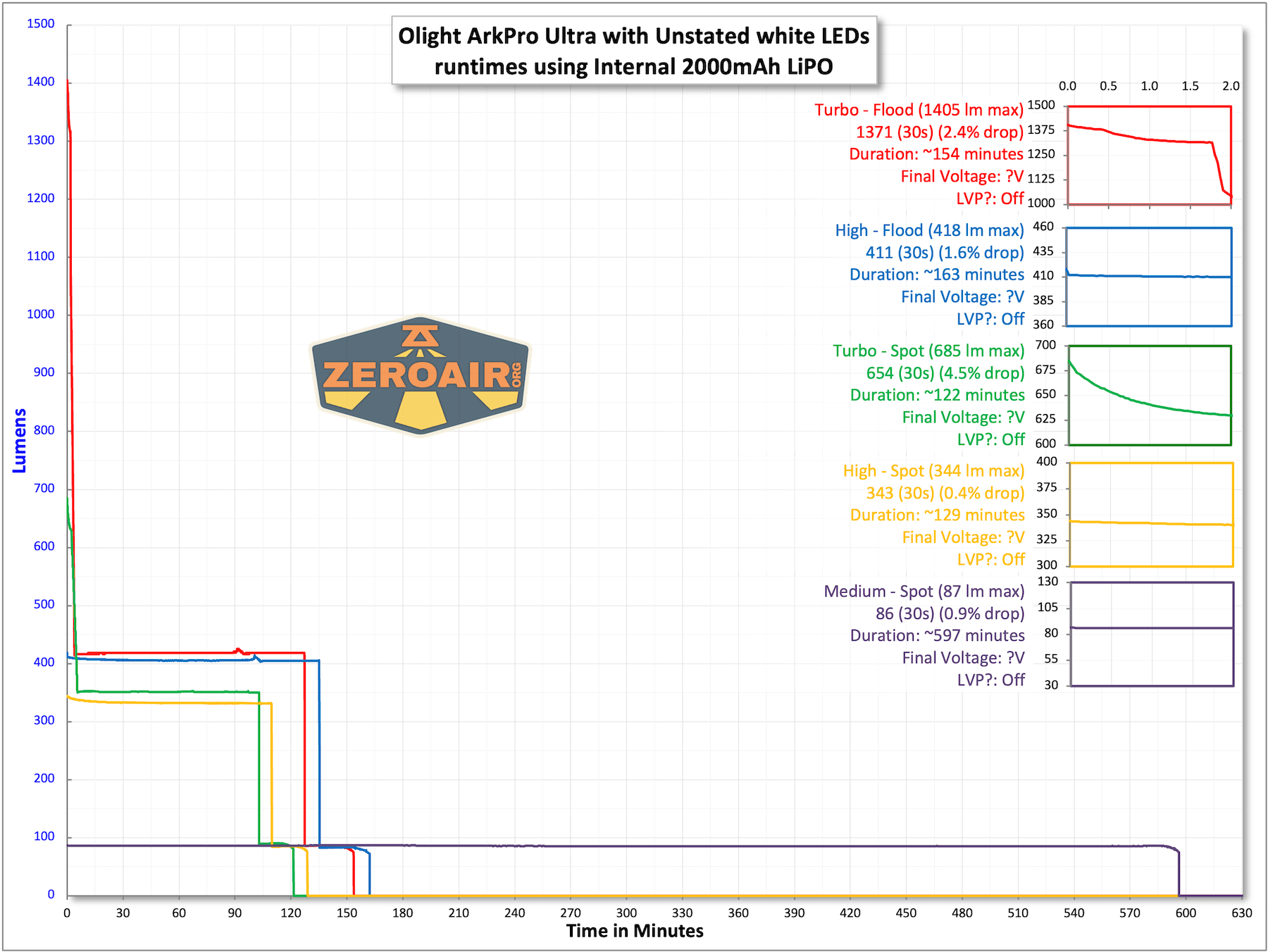 Mode Mode Claimed Output (lm) Claimed Runtime Measured Lumens