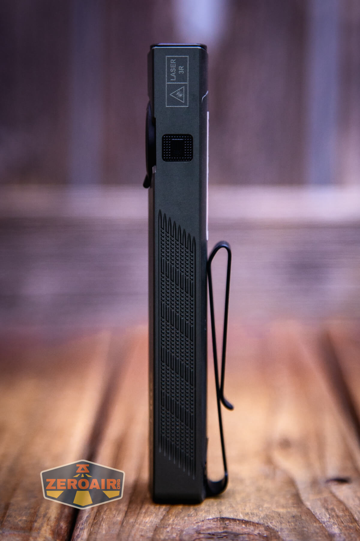 The Olight ArkPro Silver flashlight has two switches! That may be a first for the Ark series. Surrounding that e-switch is a selector knob of sorts, which points to either white LED output, ultraviolet, or laser output. Functionally, this is exactly the same as the Arkfeld Pro and Arkfeld Ultra.