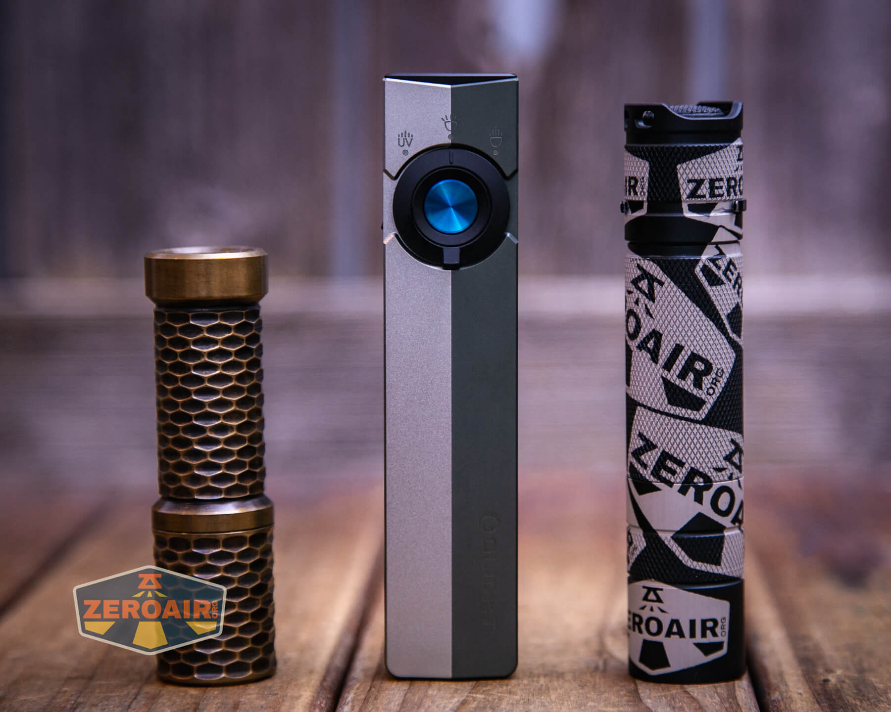 Also in the photo above, my Standard Reference Material (SRM) flashlight is the Hanko Machine Works Trident, an 18350 light. While I have not reviewed or tested the Gunner Grip version seen here, I have tested a Hanko Machine Works Trident Total Tesseract in brass. I love the Trident, and it’s a striking contrast to the inexpensive Convoy S2+, another great SRM.