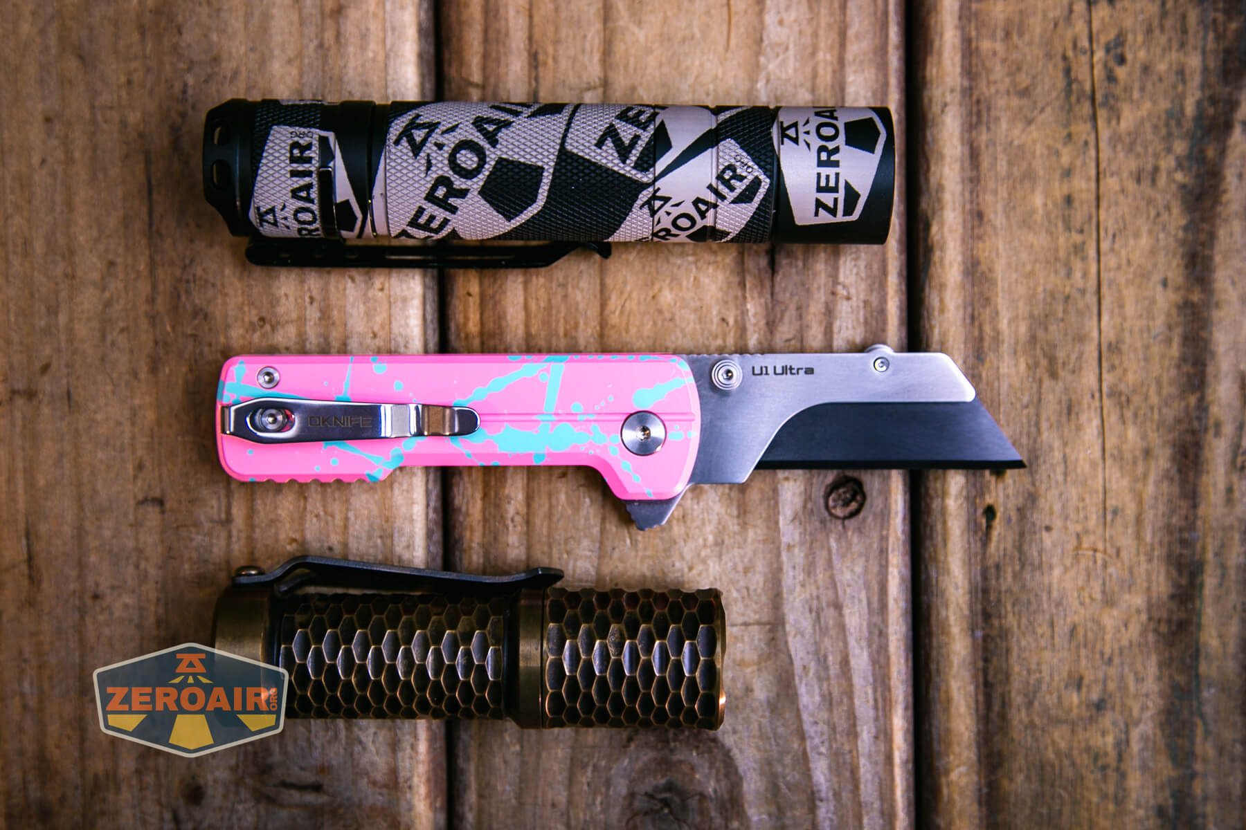 Below you can see the Oknife U1 Ultra Zombie Pink utility knife with the venerable Convoy S2+. The version below is a custom laser-engraved Convoy S2+ host by GadgetConnections.com. I did a full post on an engraved orange host right here! Or go straight to GadgetConnections.com to buy your Convoy S2+ now!
