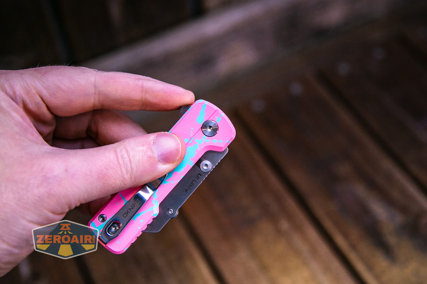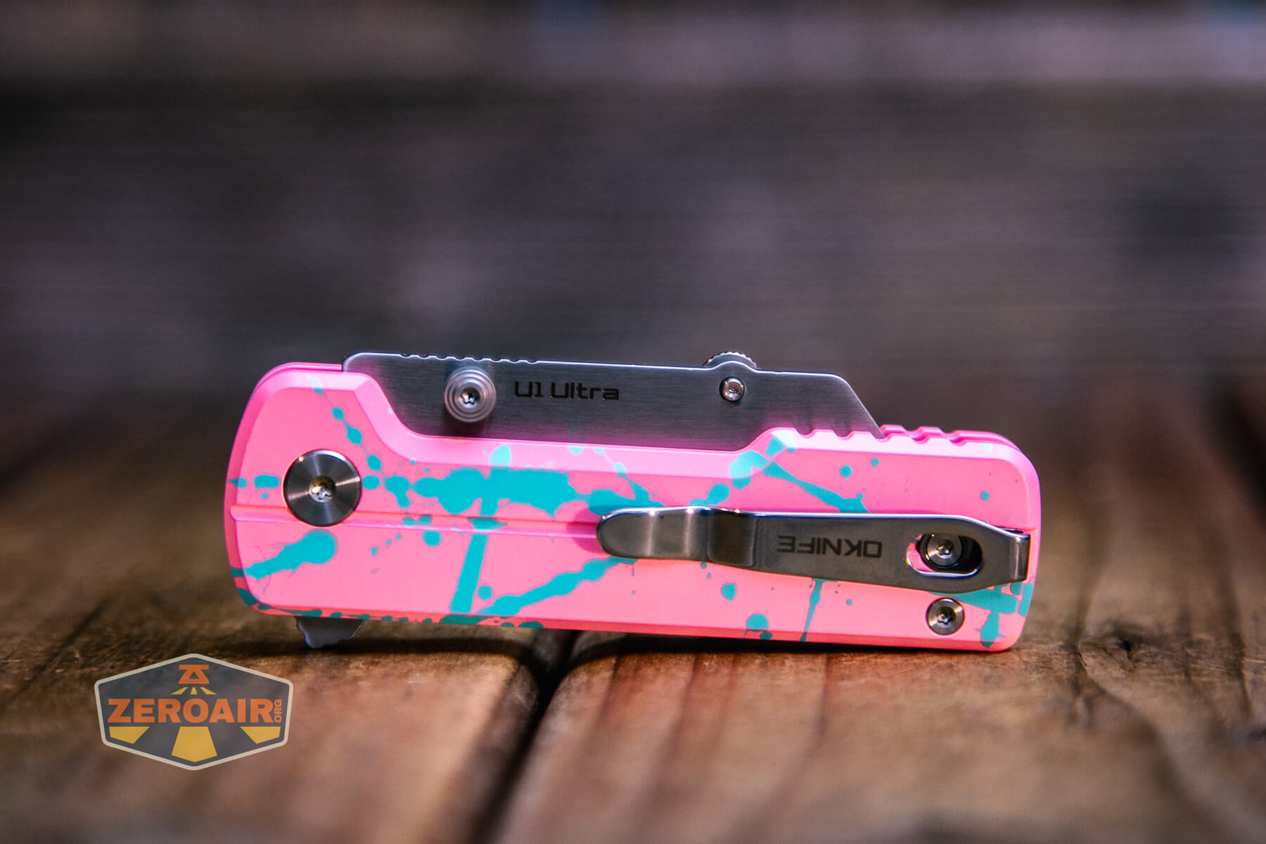 There are a number of ways to open the Oknife U1 Ultra Zombie Pink utility knife. Probably the main way is the dual thumbstud opening option.