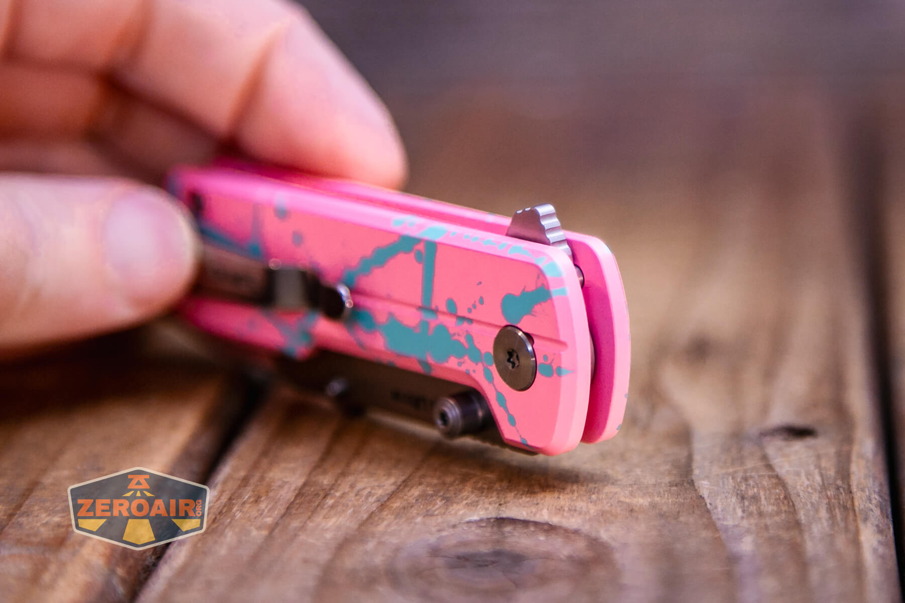 Another way to open the Oknife U1 Ultra Zombie Pink utility knife is the same way you’d close it – with this button lock on the top of the handle.