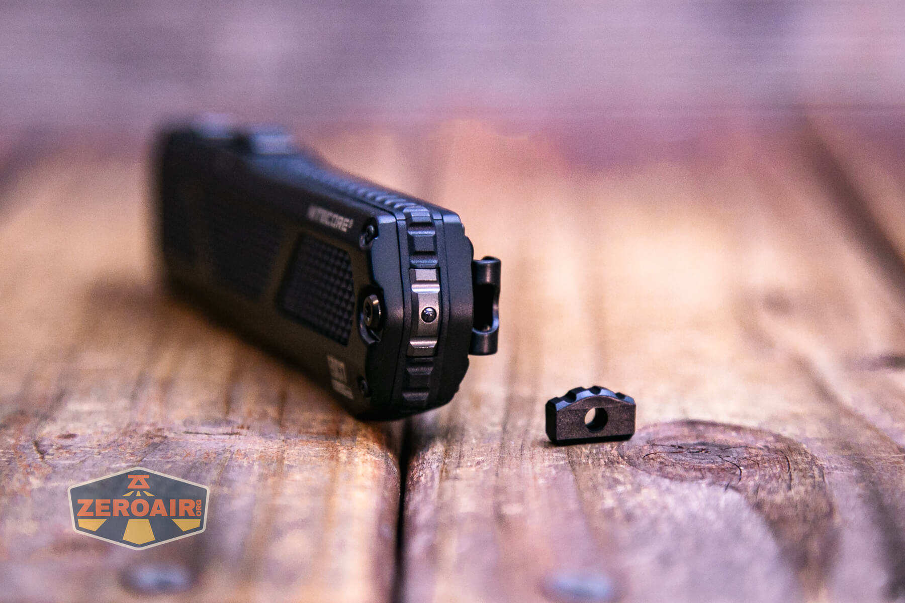 The lanyard attaches through the pocket clip, and there’s a nice big opening the shoulder to accomodate it.