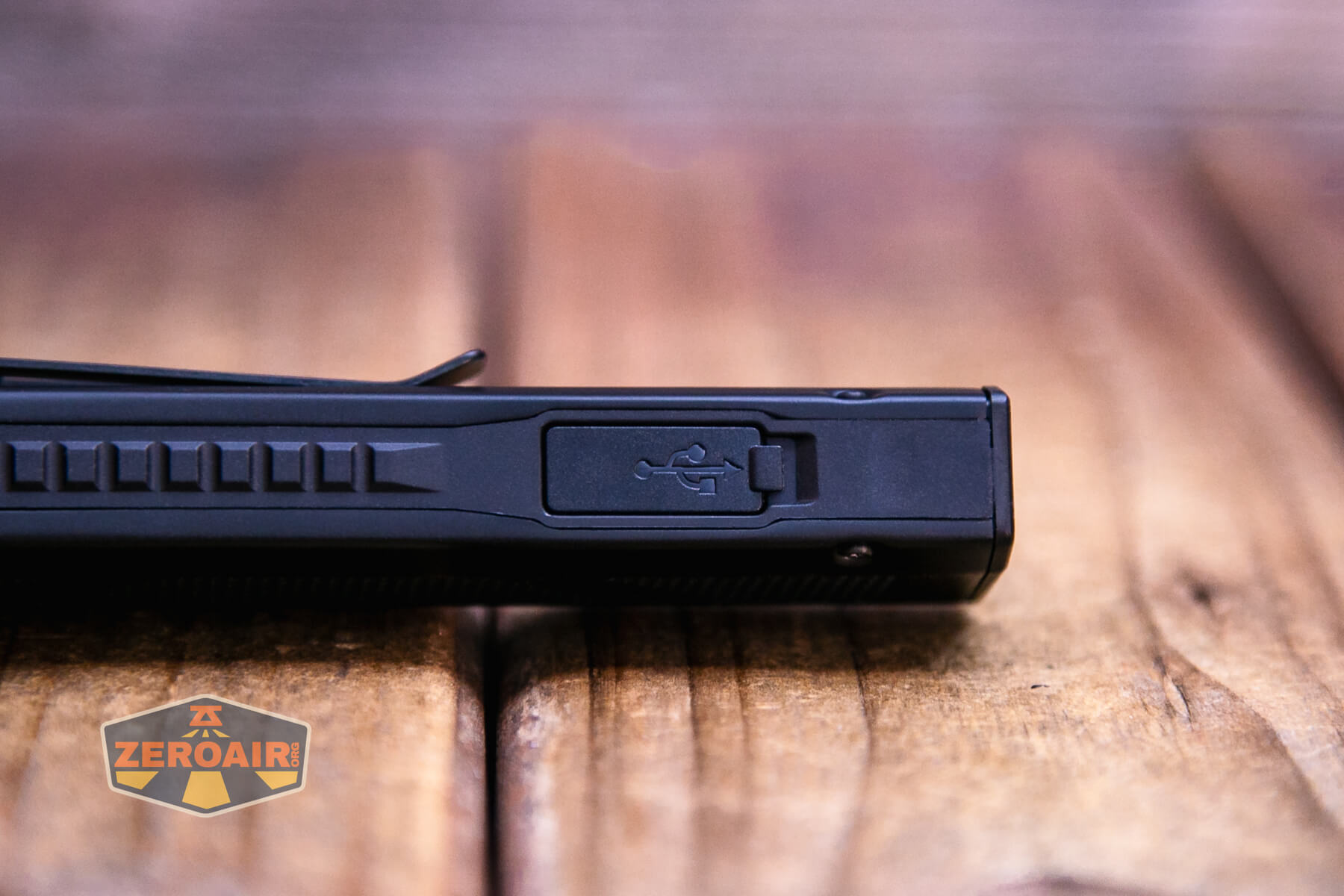 The Nitecore EDC17 flat EDC flashlight features a USB-C charging port in the head end. That charging port cover looks like the little doors Olight uses, but it’s not. It’s a hard cover that’s on a pivot.