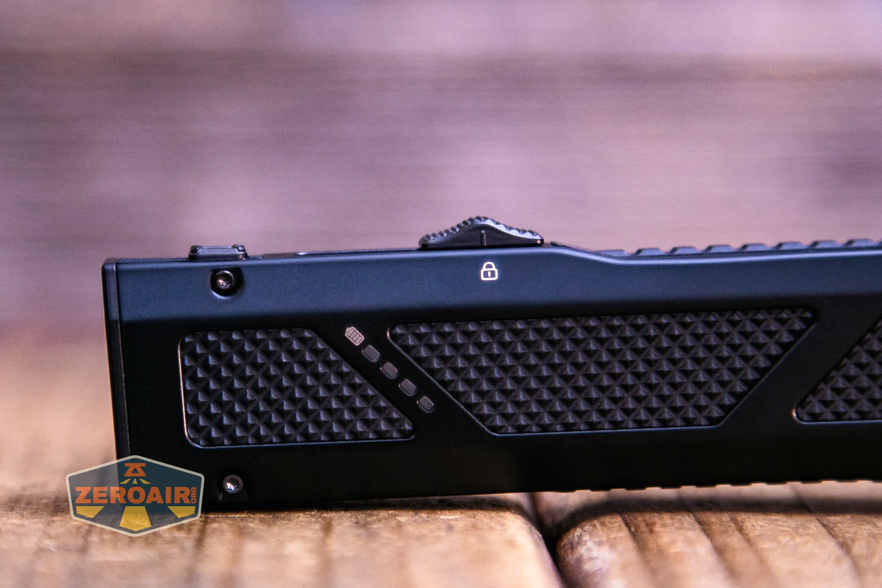 The Nitecore EDC17 flat EDC flashlight has two switches. One is a standard e-switch button but the other is a slider-style switch, again reminiscent of the OTF knives.