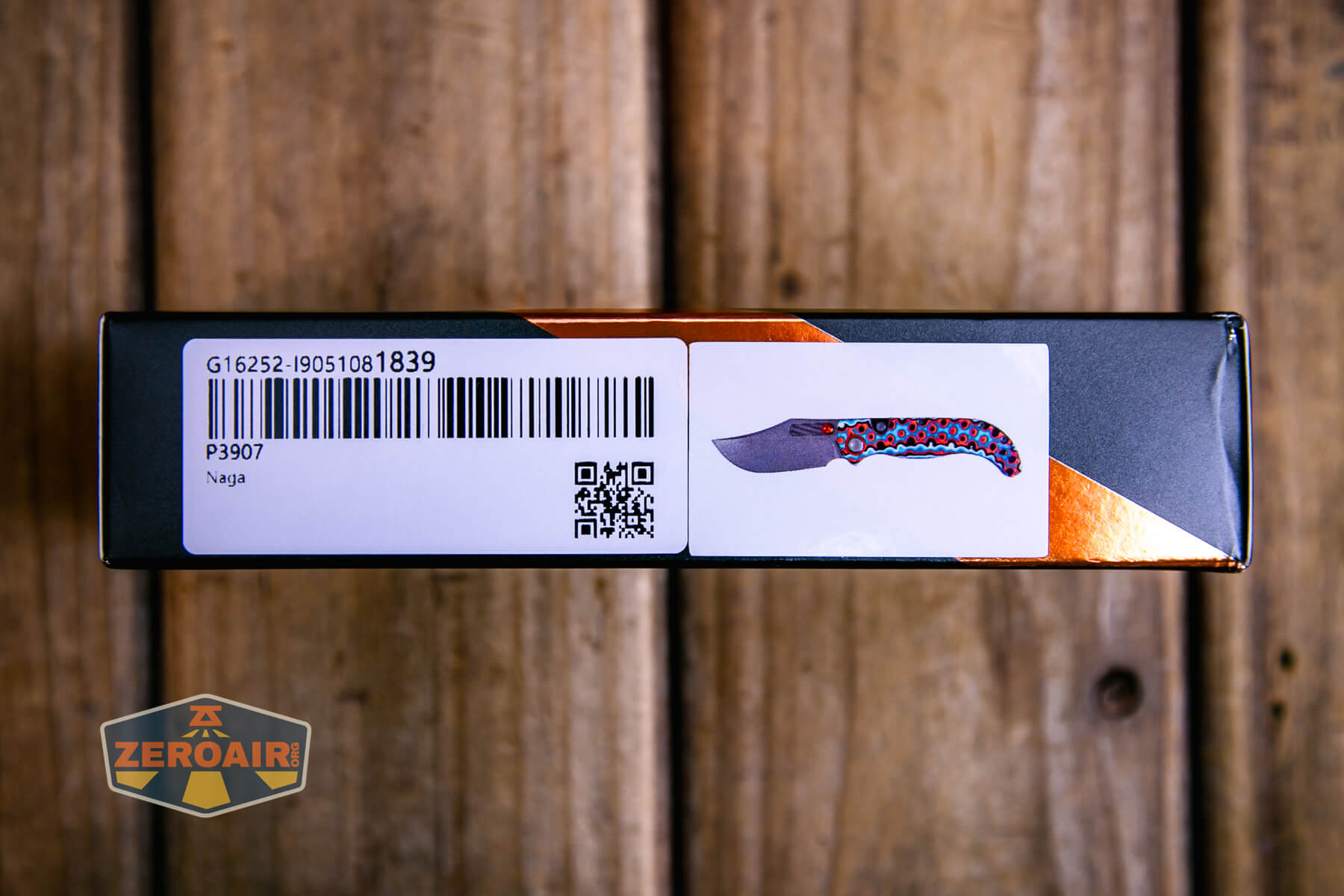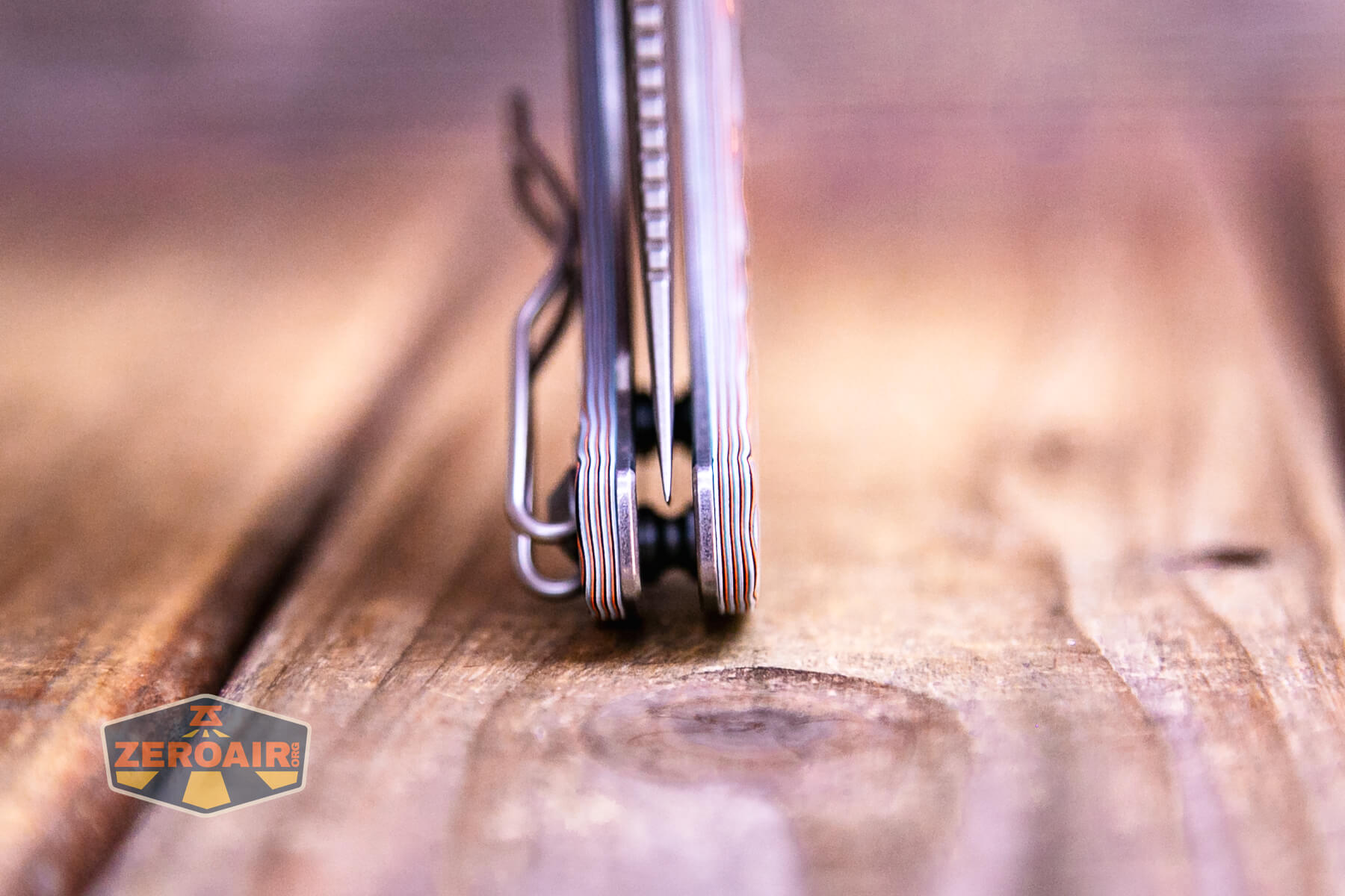 I suspected that the Canyon Current look was achieved by flat-layered Micarta being ground in such a way as to reveal the layers. But that doesn’t seem to be the case. In this knife, the Micarta layers are not flat. They’re laid down wavy! So when you flat grind a layered material, you get a finish that looks like the Vosteed Naga S35VN knife!