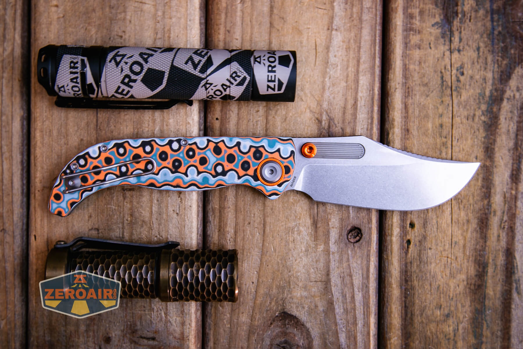 Below you can see the Vosteed Corgi V 295 Vanchor lock knife with the venerable Convoy S2+. The version below is a custom laser-engraved Convoy S2+ host by GadgetConnections.com. I did a full post on an engraved orange host right here! Or go straight to GadgetConnections.com to buy your Convoy S2+ now!