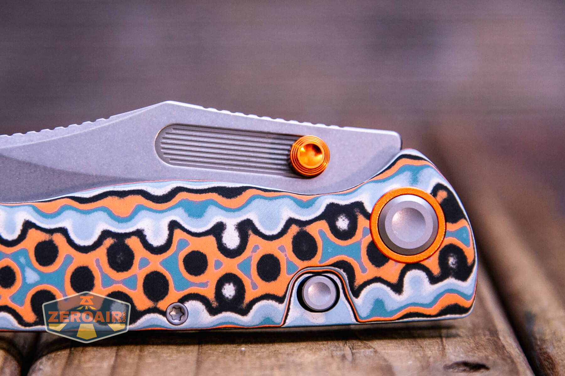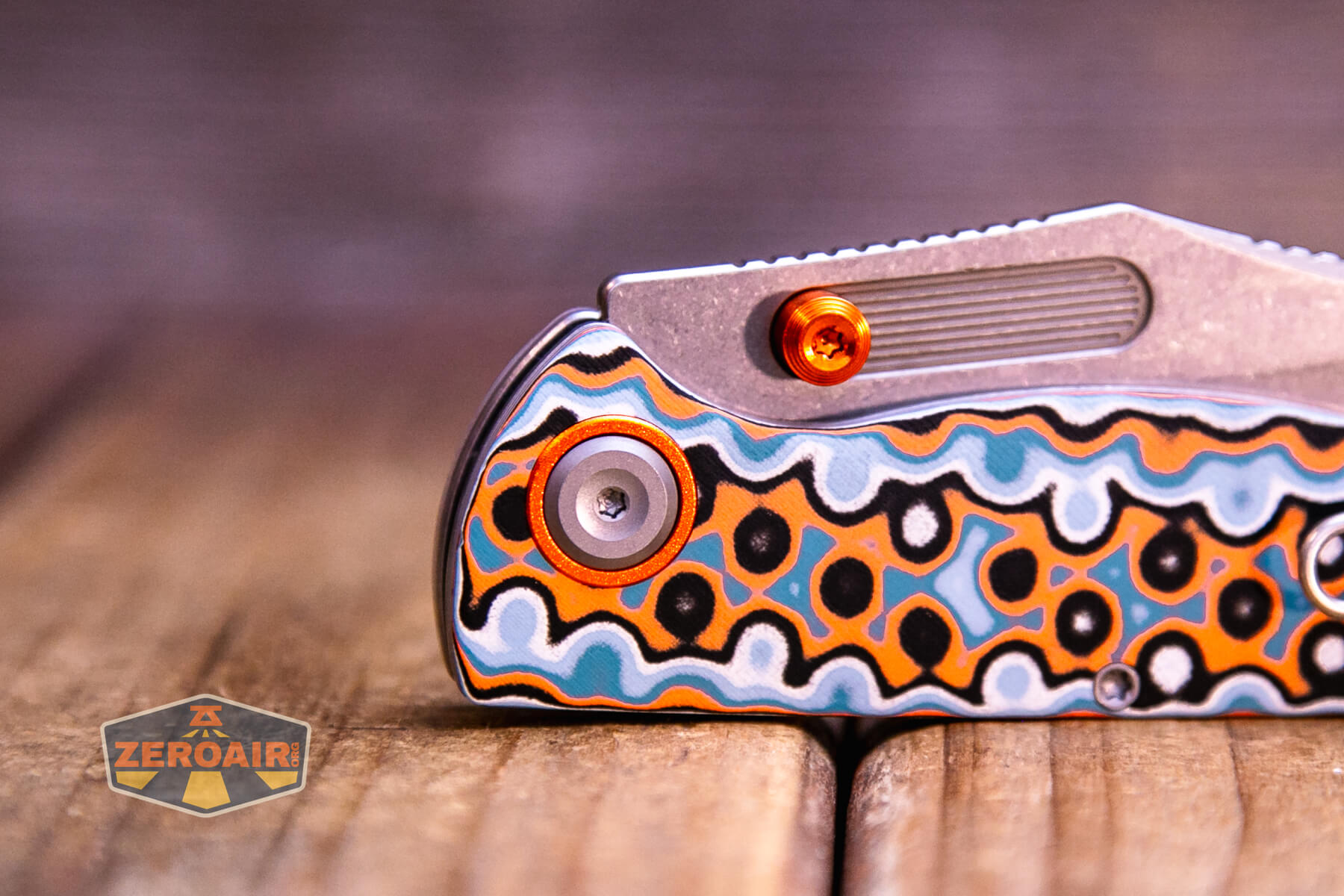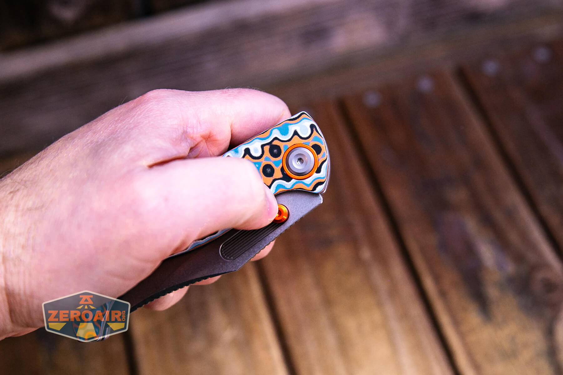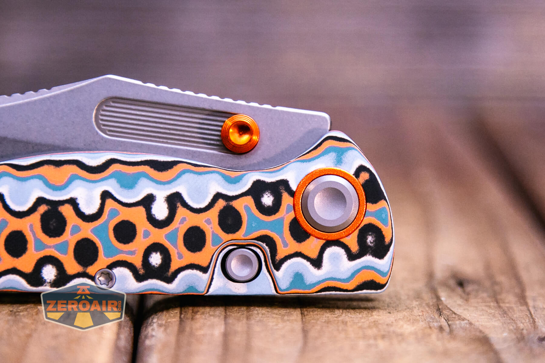 The Vosteed Naga S35VN knife offers two means for opening. One of those is this large thumbstud. This has some kind of design to appear as a slider, but it’s just a regular thumbstud (with a cool look).