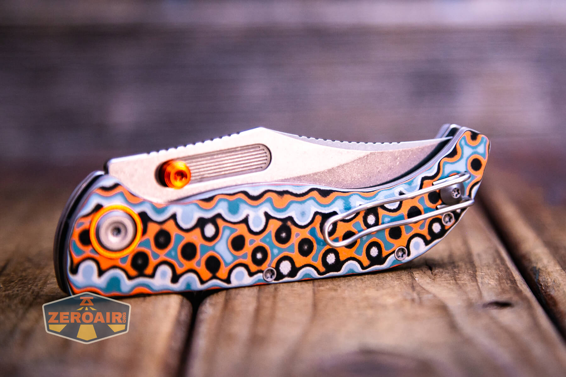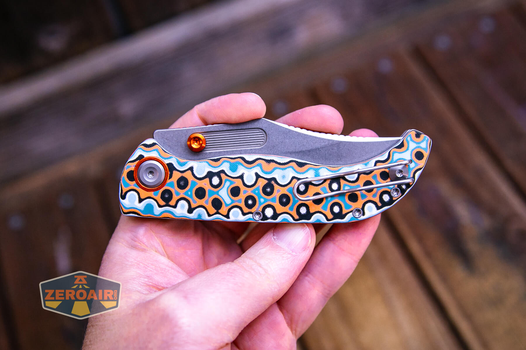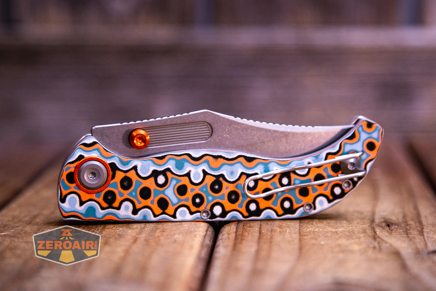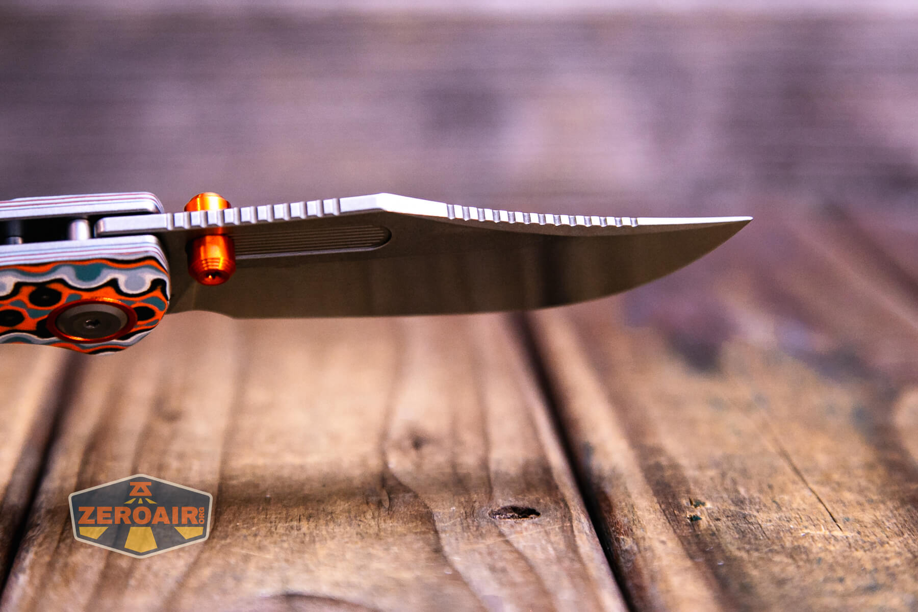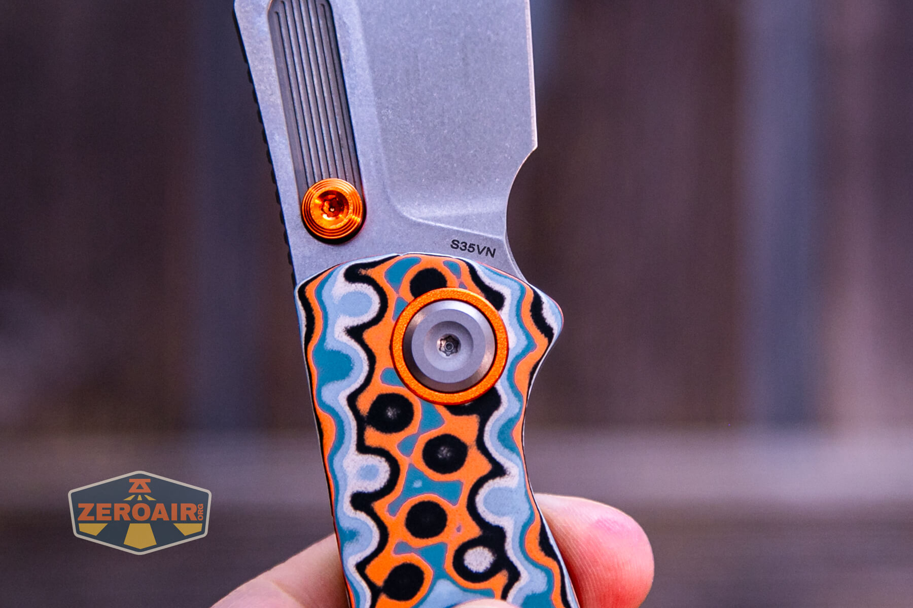 The Vosteed Naga S35VN knife offers two means for opening. One of those is this large thumbstud. This has some kind of design to appear as a slider, but it’s just a regular thumbstud (with a cool look).