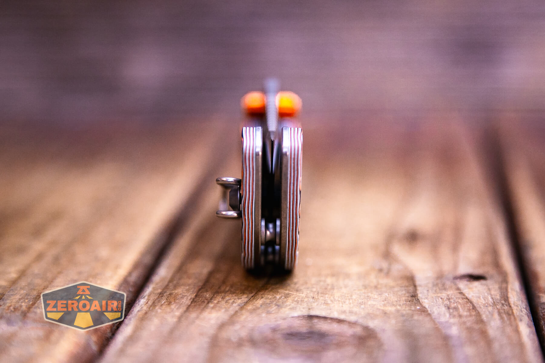 What I consider the second option for opening the Vosteed Naga S35VN knife is the button lock. Pressing the button lock (which you can see above in profile, and below in front view) releases the blade, which can then be flipped open.