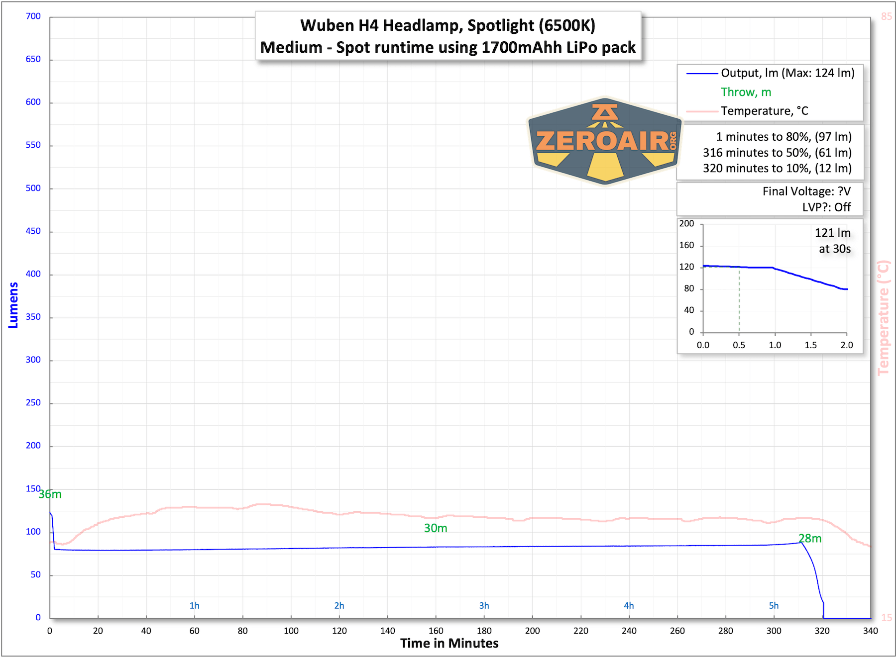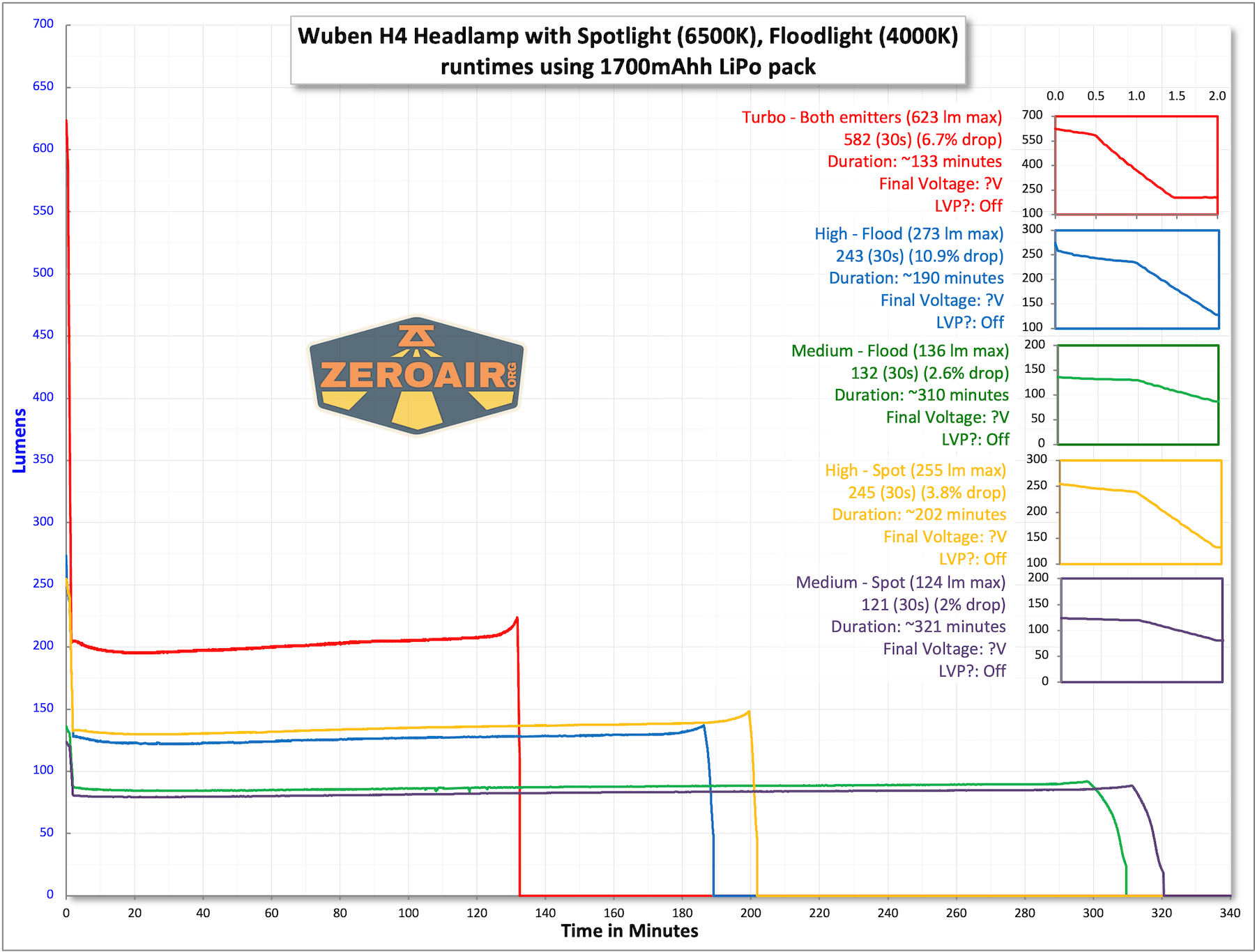 Below you can see runtime tests for a number of modes. Output isn’t all that high, but is approximately around the claimed levels, which is great.