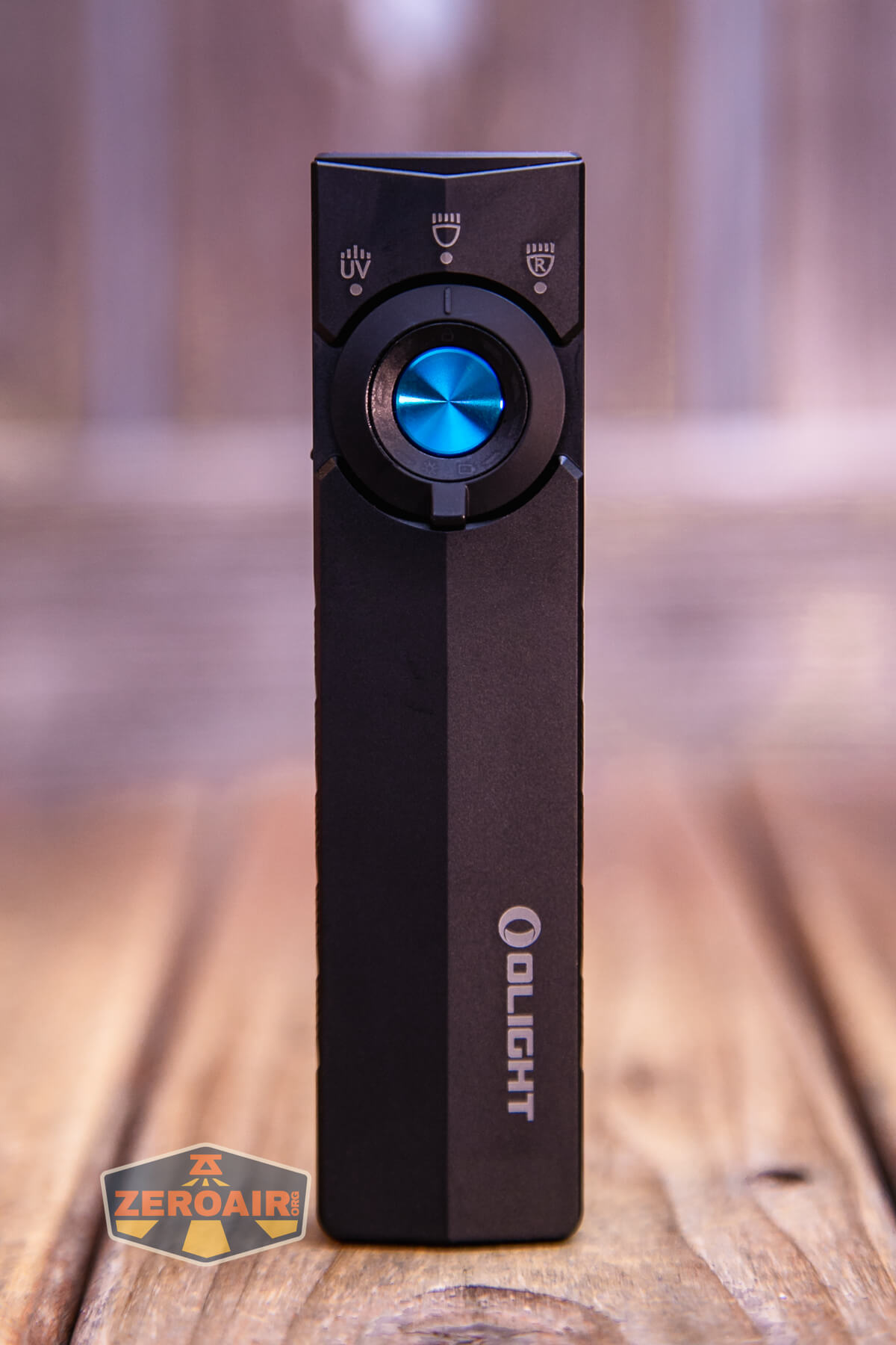 The Olight ArkPro Lite flashlight has two switches! Surrounding that e-switch is a selector knob of sorts, which points to either ultraviolet, white LED output, or red output.
