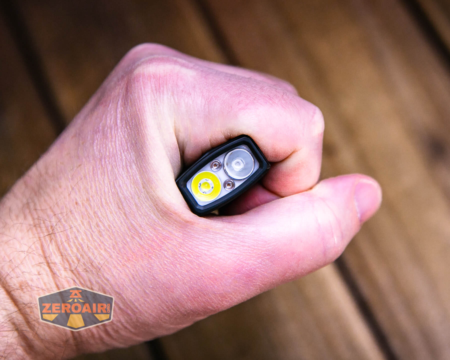 They say the LED e-switch is great for thumb use, and I am inclined to agree. There’s a nicely sized pad area for my thumb to rest. The concave around the rotary helps with this, too. Despite the text, below, I’m using my index thumb to actuate the switch. It’s fully depressed here, just like I must be to invent a term like “index thumb” to go along with a photo that doesn’t match Olight’s promotional material!