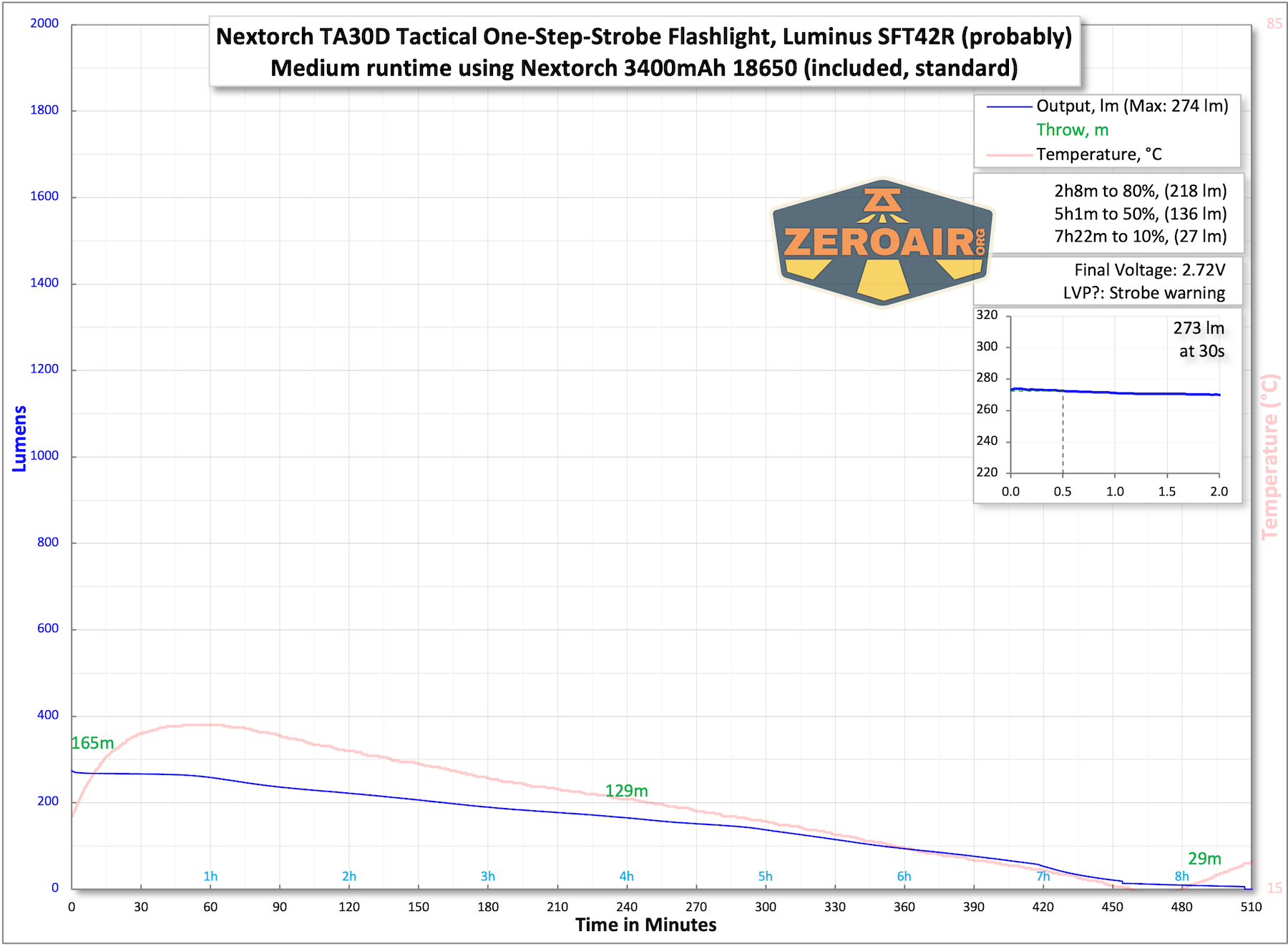 Below are a couple of runtime tests. What we see is a fairly quick (but not “abusive”) stepdown. By “not abusive,” I mean it doesn’t seem like Nextorch is gaming the claim system. Around 1 minute at the very bright output is respectable.