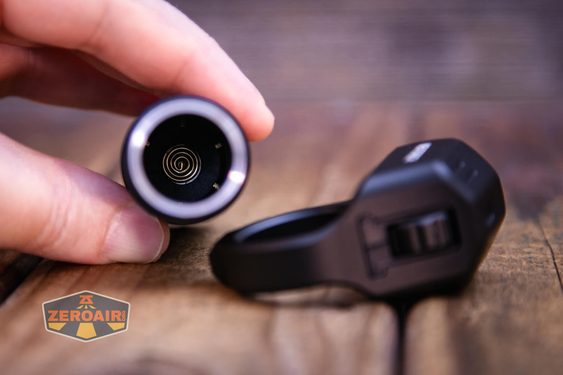 Only the tailcap (and thus tactical grip ring) comes off of the Nextorch Artorch Compact EDC tactical flashlight. Removing this reveals a big spring on the tail end and anodized threads.