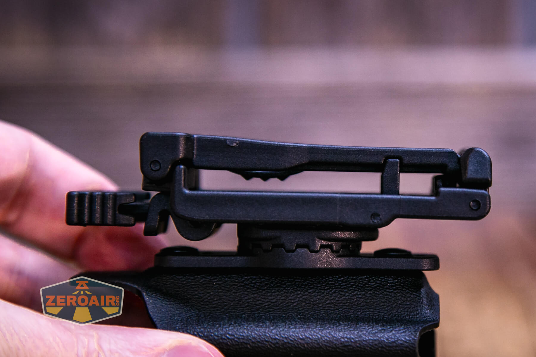 I’ve already mentioned the tactical grip ring (which isn’t really for carry, it’s for use). Included in my kit was this V42 X-Carry belt-attaching sheath. It’s a hard case, and the Nextorch Artorch Compact EDC tactical flashlight will fit with the ring forward or backward.