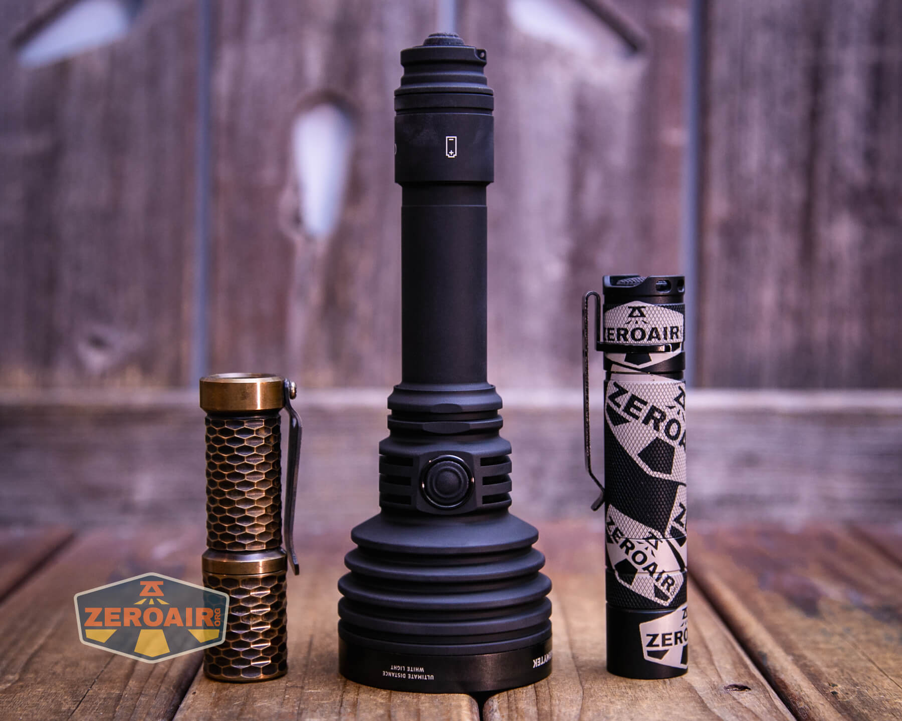 Also in the photo above, my Standard Reference Material (SRM) flashlight is the Hanko Machine Works Trident, an 18350 light. While I have not reviewed or tested the Gunner Grip version seen here, I have tested a Hanko Machine Works Trident Total Tesseract in brass. I love the Trident, and it’s a striking contrast to the inexpensive Convoy S2+, another great SRM.