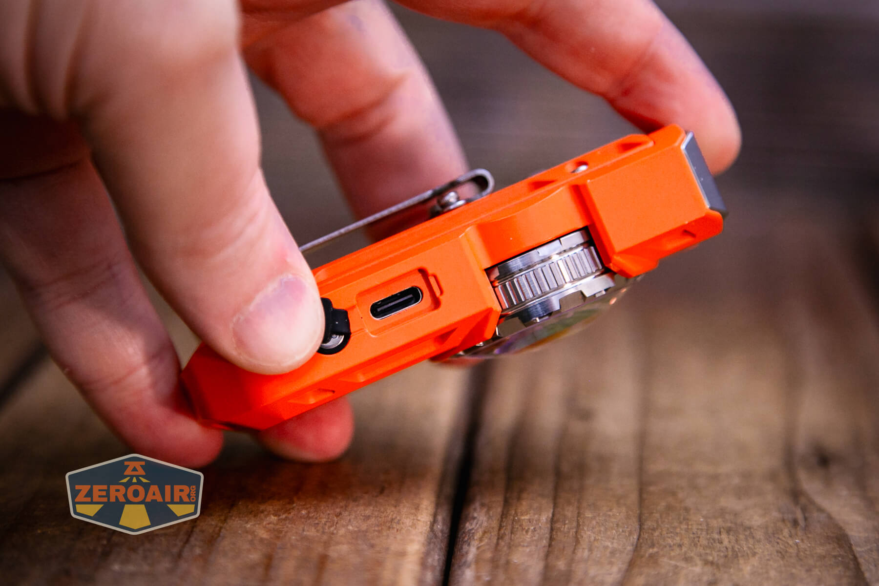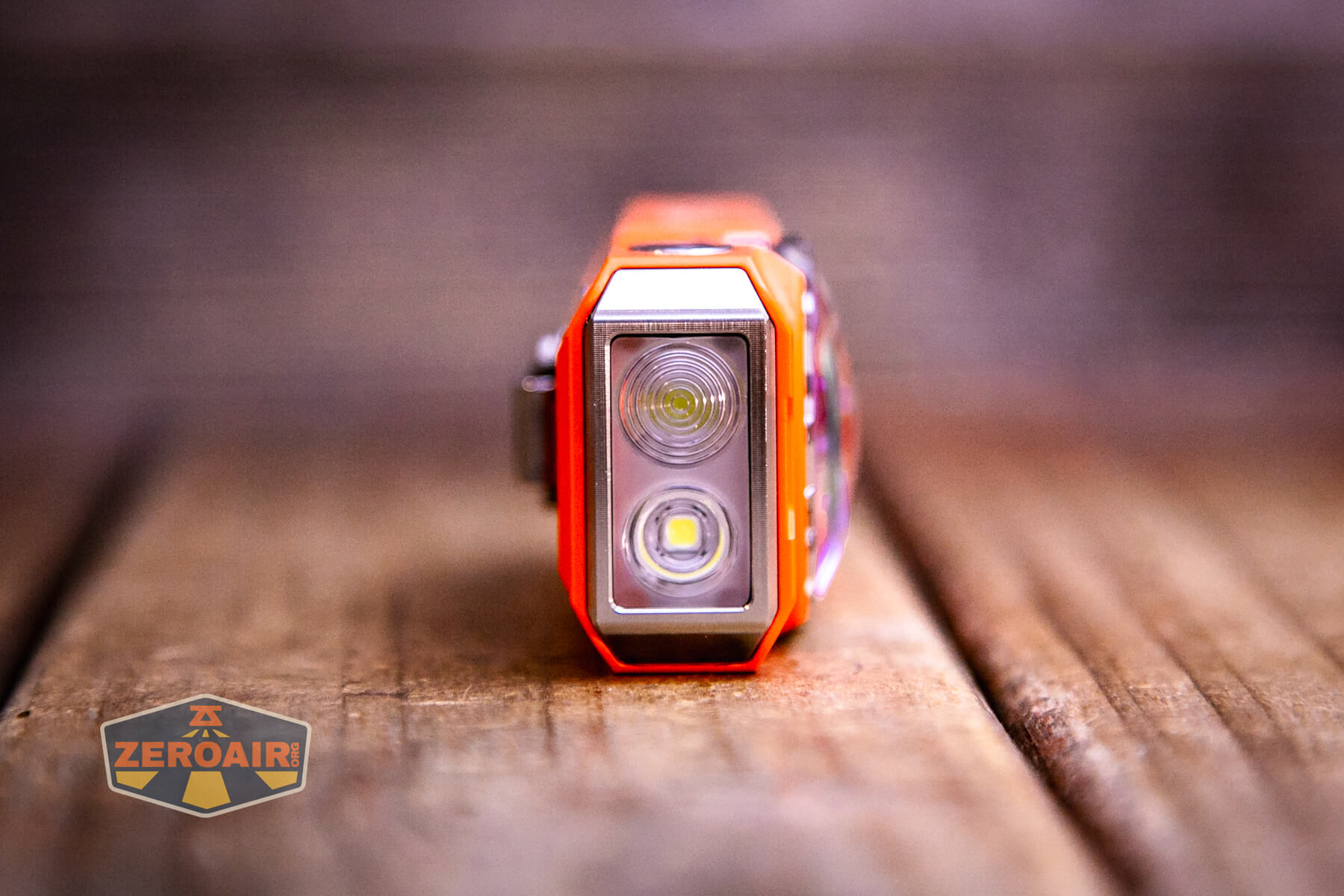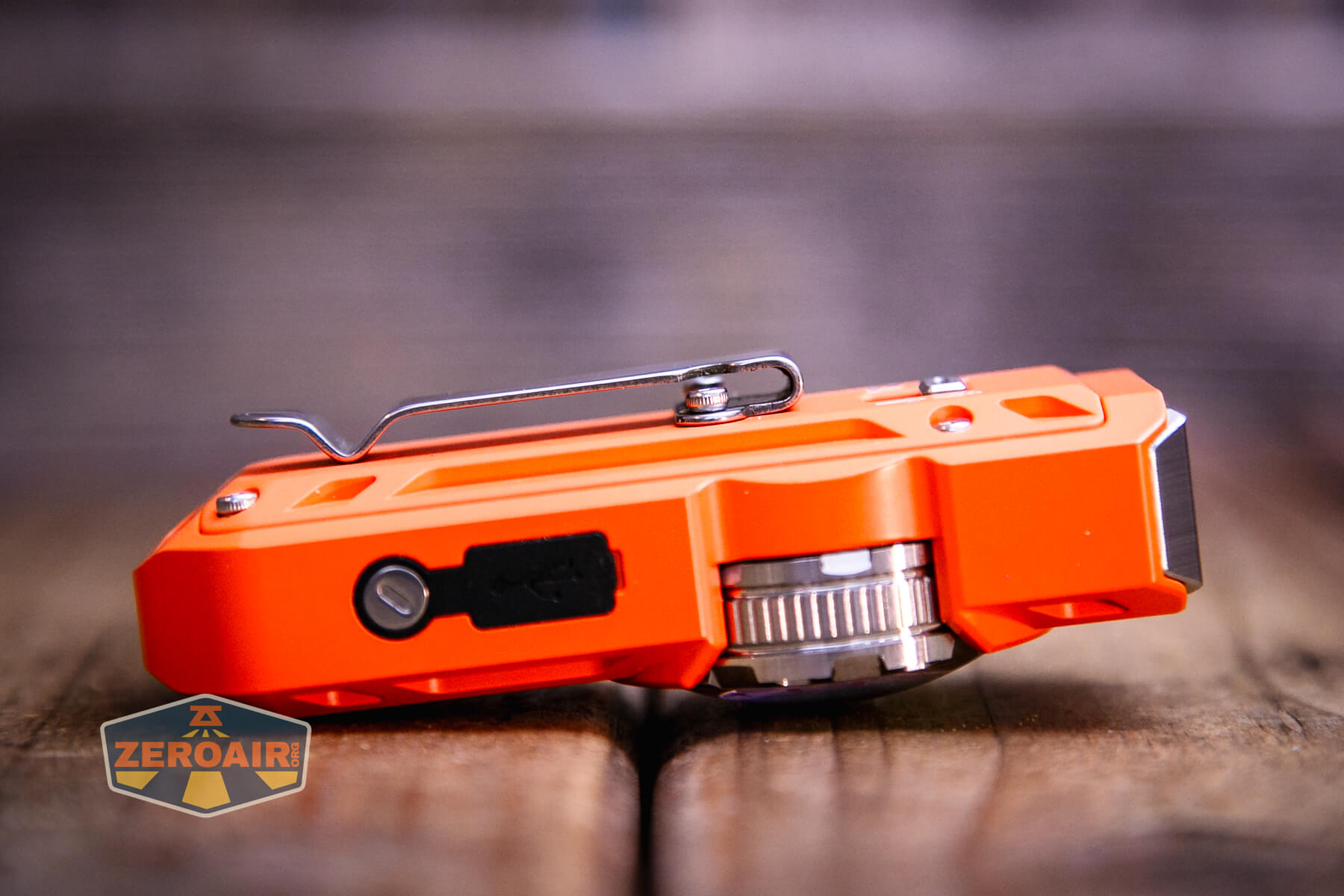 Multiple body colors are available. They include silver, purple, blue, green, orange cerakote (seen here), and yellow cerakote. Some of those are aluminum, but this orange cerakote is stainless steel. They all have the same emitters and features.