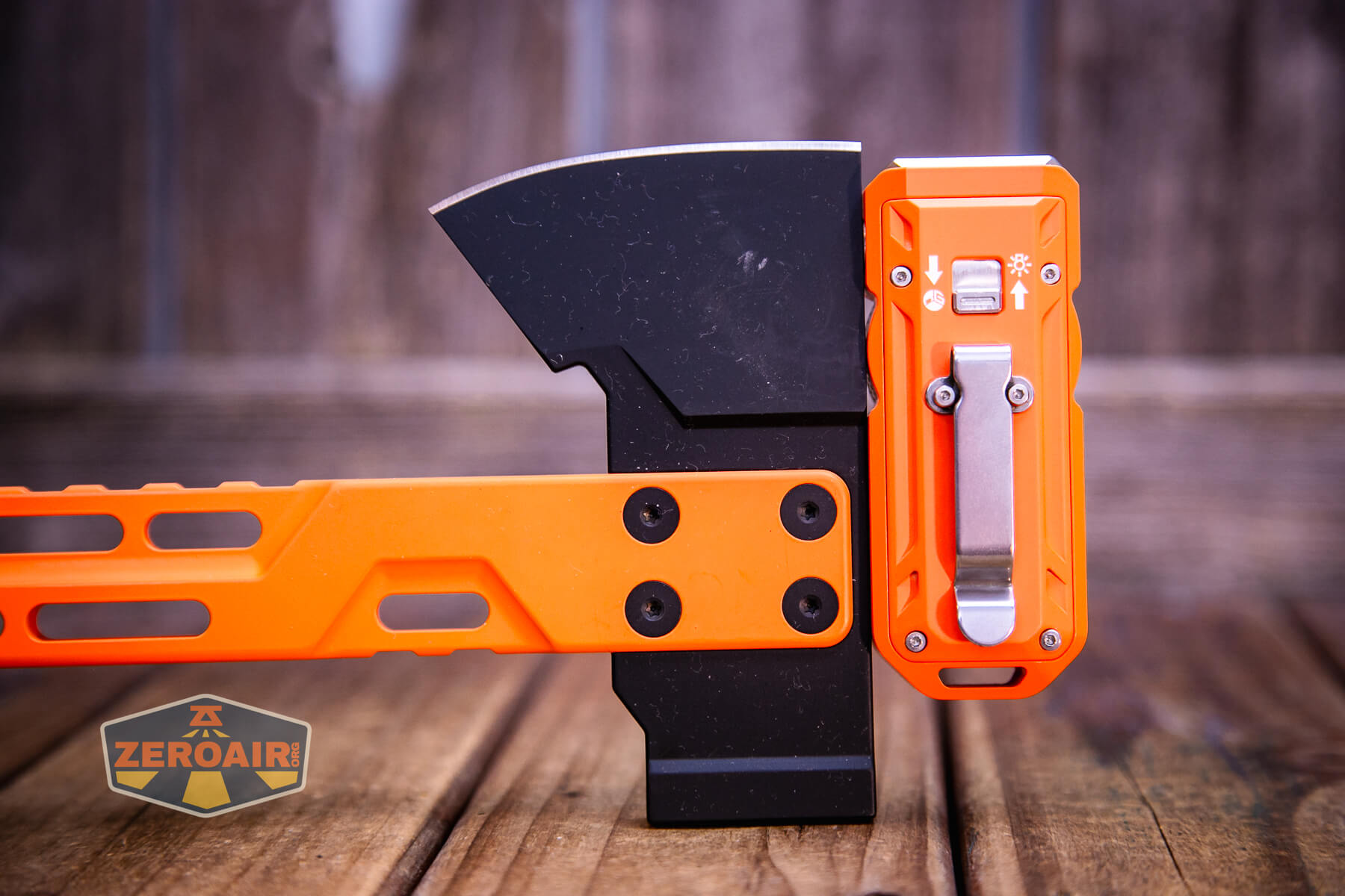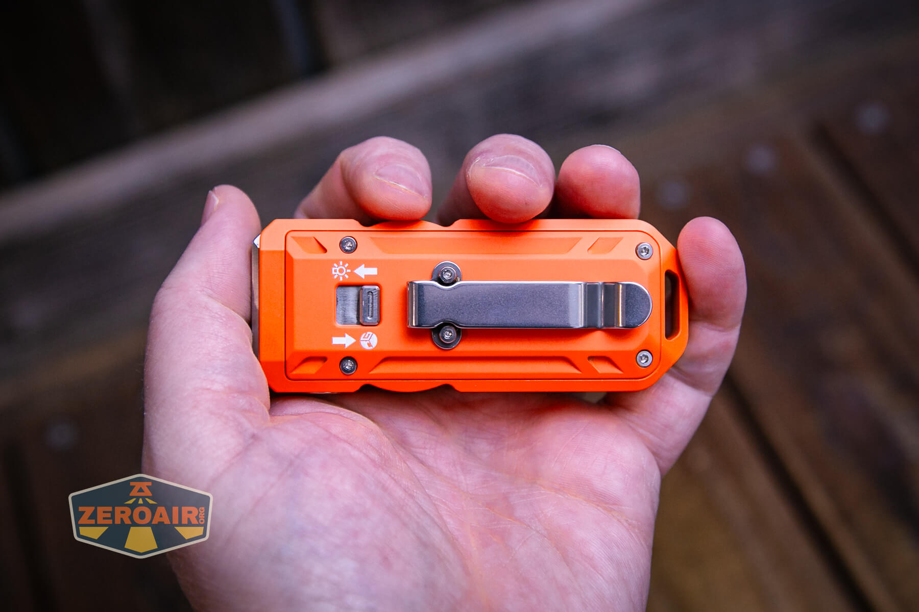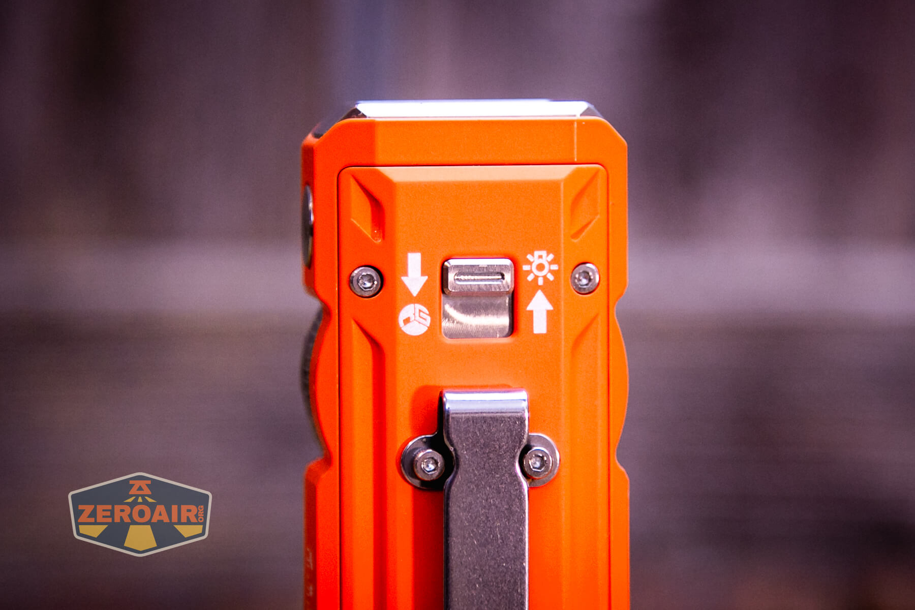 Multiple body colors are available. They include silver, purple, blue, green, orange cerakote (seen here), and yellow cerakote. Some of those are aluminum, but this orange cerakote is stainless steel. They all have the same emitters and features.