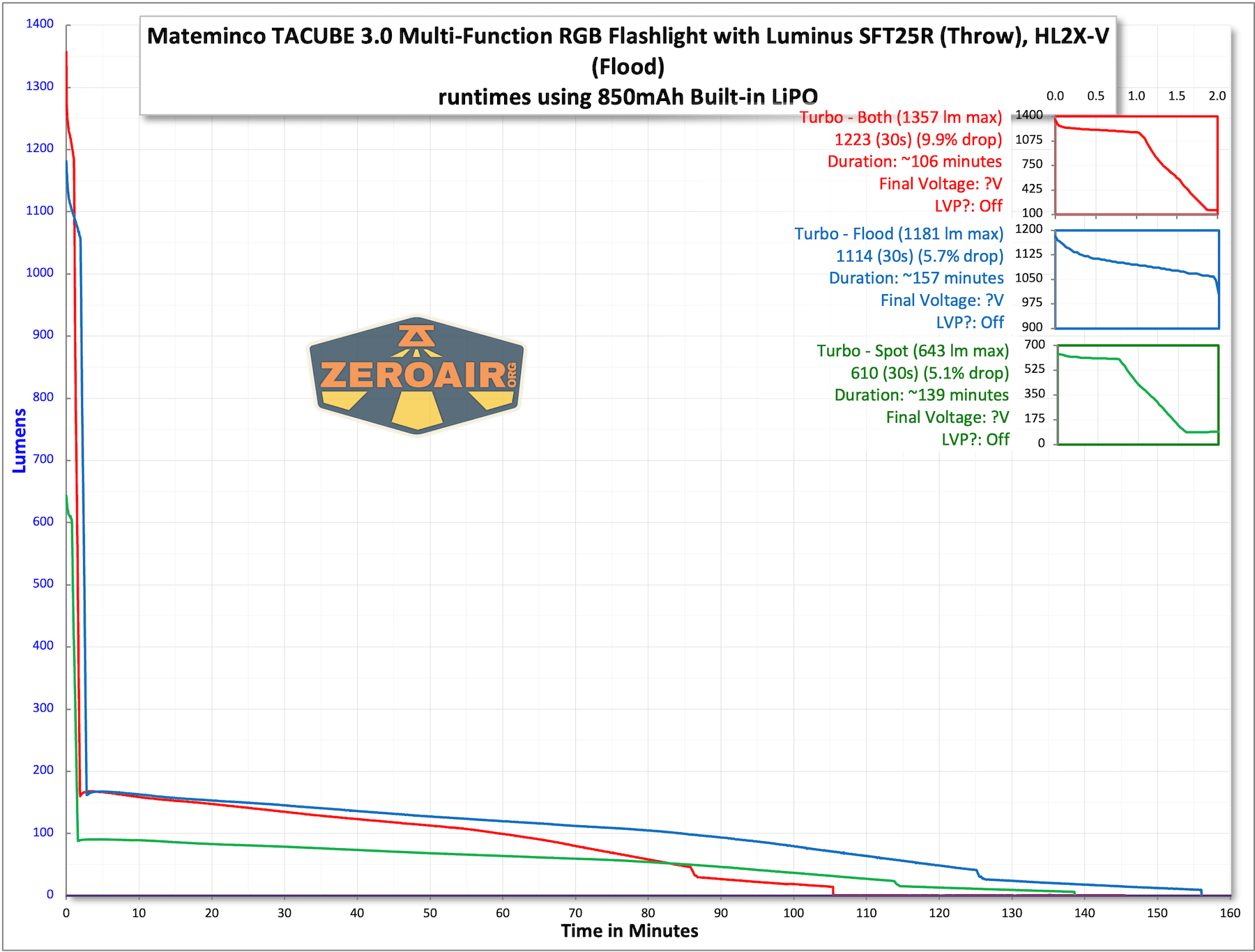 | Mode | Mode Claimed Output (lm) | Claimed Runtime | Measured Lumens |